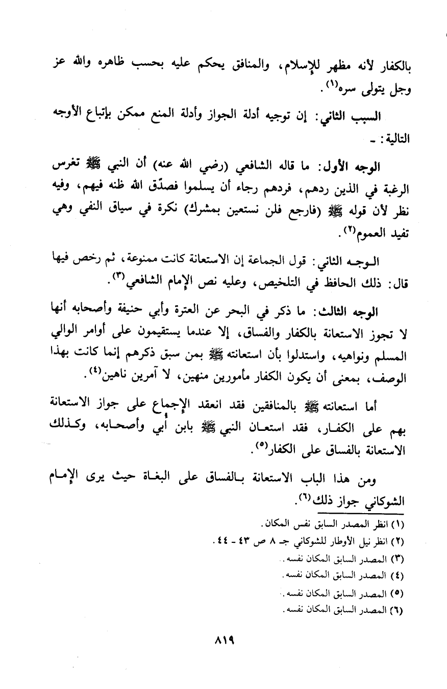 ومن هذا الباب الاستعانة بالفساق على البغاة حيث يرى الإمام الشوكاني جواز ذلك (¬6).