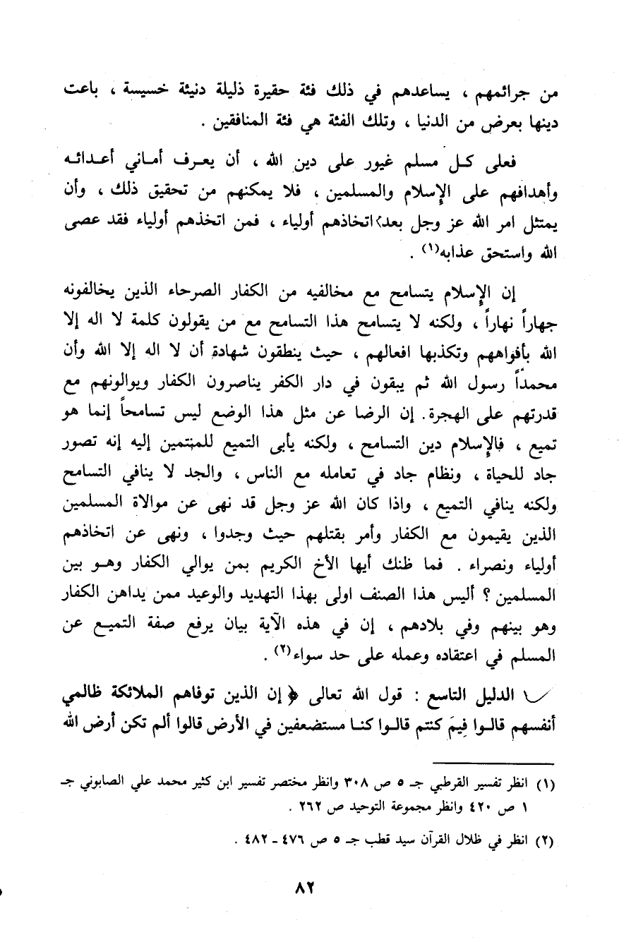 إن الإسلام يتسامح مع مخالفيه من الكفار الصرحاء الذين يخالفونه جهارًا نهارا، ولكنه لا يتسامح هذا التسامح مع من يقولون كلمة لا إله إلا الله بأفواههم وتكذبها أفعالهم، حيث ينطقون شهادة أن لا إله إلا الله وأن محمدا رسول الله ثم يبقون في دار الكفر يناصرون الكفار ويوالونهم مع قدرتهم على الهجرة، إن الرضا عن مثل هذا الوضع ليس تسامحا إنما هو تميع، فالإسلام دين التسامح، ولكنه يأبى التميع للمنتمين إليه إنه تصور جاد للحياة، ونظام جاد في تعامله مع الناس، والجد لا ينافي التسامح ولكنه ينافي التميع، وإذا كان الله عز وجل قد نهى عن موالاة المسلمين الذين يقيمون مع الكفار وأمر بقتلهم حيث وجدوا، ونهى عن اتخاذهم أولياء ونصراء، فما ظنك أيها الأخ الكريم بمن يوالي الكفار وهو بين المسلمين؟ أليس هذا الصنف أولى بهذا التهديد والوعيد ممن يداهن الكفار وهو بينهم وفي بلادهم، إن في هذه الآية بيان يرفع صفة التميع عن المسلم في اعتقاده وعمله على حد سواء (¬2).