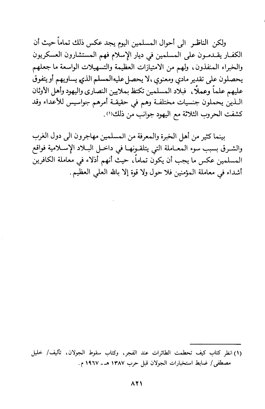 ولكن الناظر إلى أحوال المسلمين اليوم يجد عكس ذلك تمامًا حيث إن الكفار يقدمون على المسلمين في ديار الإسلام فهم المستشارون العسكريون والخبراء المنفذون، ولهم من الامتيازات العظيمة والتسهيلات الواسعة ما جعلهم يحصلون على تقدير مادي ومعنوي، لا يحصل عليه المسلم الذي يساويهم أو يتفوق عليهم علمًا وعملاً، فبلاد المسلمين تكتظ بملايين النصارى واليهود وأهل الأوثان الذين يحملون جنسيات مختلفة وهم في حقيقة أمرهم جواسيس للأعداء وقد كشفت الحروب الثلاثة مع اليهود جوانب من ذلك (¬1).