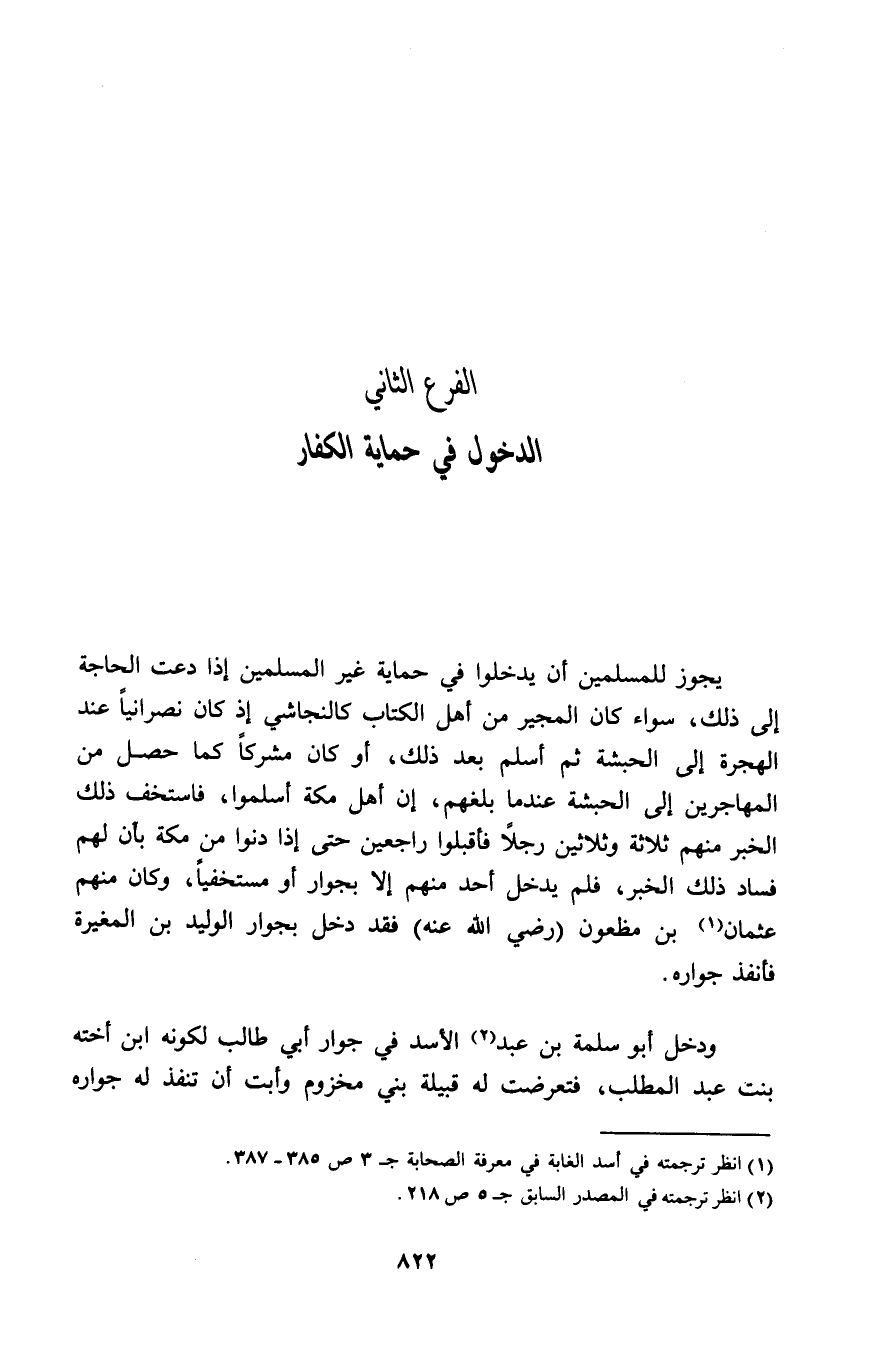 يجوز للمسلمين أن يدخلوا في حماية غير المسلمين إذا دعت الحاجة إلى ذلك، سواء كان المجير من أهل الكتاب كالنجاشي إذ كان نصرانيًا عند الهجرة إلى الحبشة ثم أسلم بعد ذلك، أو كان مشركًا كما حصل من المهاجرين إلى الحبشة عندما بلغهم، إن أهل مكة أسلموا، فاستخف ذلك الخبر منهم ثلاثة وثلاثين رجلاً فأقبلوا راجعين حتى إذا دنوا من مكة بان لهم فساد ذلك الخبر، فلم يدخل أحد منهم إلا بجوار أو مستخفيًا، وكان منهم عثمان (¬1) بن مظعون (رضي الله عنه) فقد دخل بجوار الوليد بن المغيرة فأنفذ جواره.