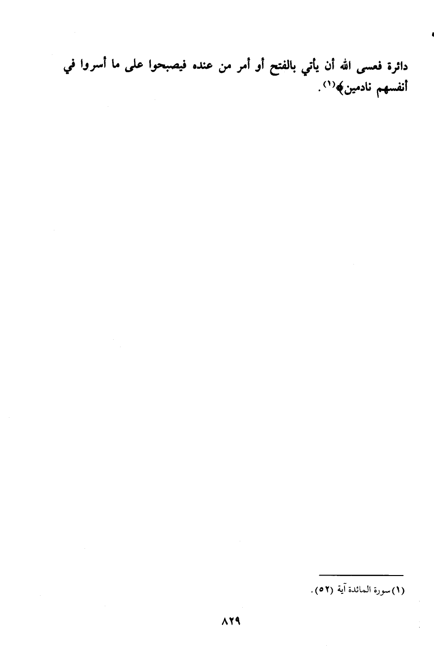 دَائِرَةٌ فَعَسَى اللَّهُ أَنْ يَأْتِيَ بِالْفَتْحِ أَوْ أَمْرٍ مِنْ عِنْدِهِ فَيُصْبِحُوا عَلَى مَا أَسَرُّوا فِي أَنْفُسِهِمْ نَادِمِينَ) (¬1).
