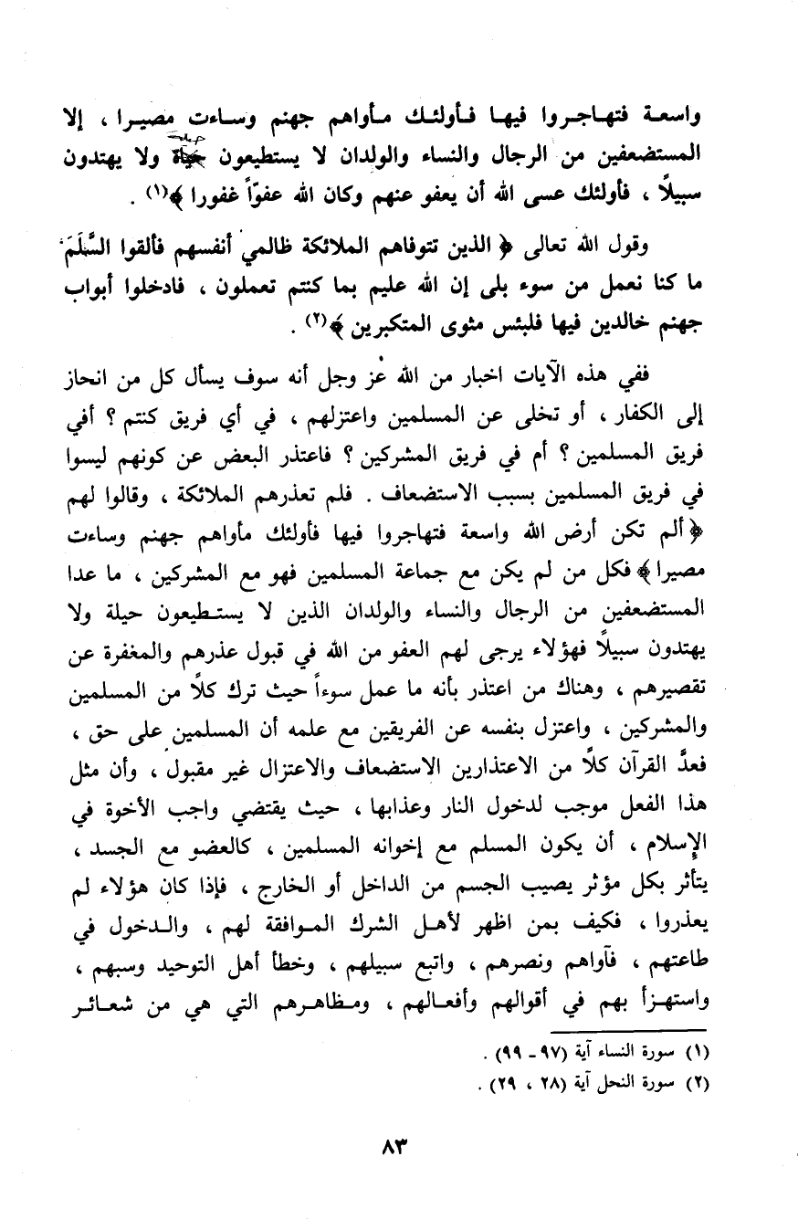 ففي هذه الآيات إخبار من الله عز وجل أنه سوف يسأل كل من انحاز إلى الكفار، أو تخلى عن المسلمين واعتزلهم في أي فريق كنتم؟ أفي فريق المسلمين؟ أم في فريق المشركين؟ فاعتذر البعض عن كونهم ليسوا في فريق المسلمين بسبب الاستضعاف، فلم تعذرهم الملائكة، وقالوا لهم (أَلَمْ تَكُنْ أَرْضُ اللهِ وَاسِعَةً فَتُهَاجِرُوا فِيهَا فَأُولَئِكَ مَأْوَاهُمْ جَهَنَّمُ وَسَاءَتْ مَصِيرًا) فكل من لم يكن مع جماعة المسلمين فهو مع المشركين، ما عدا المستضعفين من الرجال والنساء والولدان الذين لا يستطيعون حيلة ولا يهتدون سبيلا فهؤلاء يرجى لهم العفو من الله في قبول عذرهم والمغفرة عن تقصيرهم وهناك من اعتذر بأنه ما عمل سوءا حيث ترك كلا من المسلمين والمشركين، واعتزل بنفسه عن الفريقين مع علمه أن المسلمين على حق، فعد القرآن كلا من الاعتذارين الاستضعاف والاعتزال غير مقبول، وأن مثل هذا الفعل موجب لدخول النار وعذابها، حيث يقتضي واجب الأخوة في الإسلام، أن يكون المسلم مع إخوانه المسلمين، كالعضو مع الجسد، يتأثر بكل مؤثر يصيب الجسم من الداخل أو الخارج، فإذا كان هؤلاء لم يعذروا فكيف بمن أظهر لأهل الشرك الموافقة لهم، والدخول في طاعتهم، فآواهم ونصرهم، واتبع سبيلهم، وخطًأ أهل التوحيد وسبهم، واستهزأ بهم في أقوالهم وأفعالهم، ومظاهرهم، التي هي من شعائر