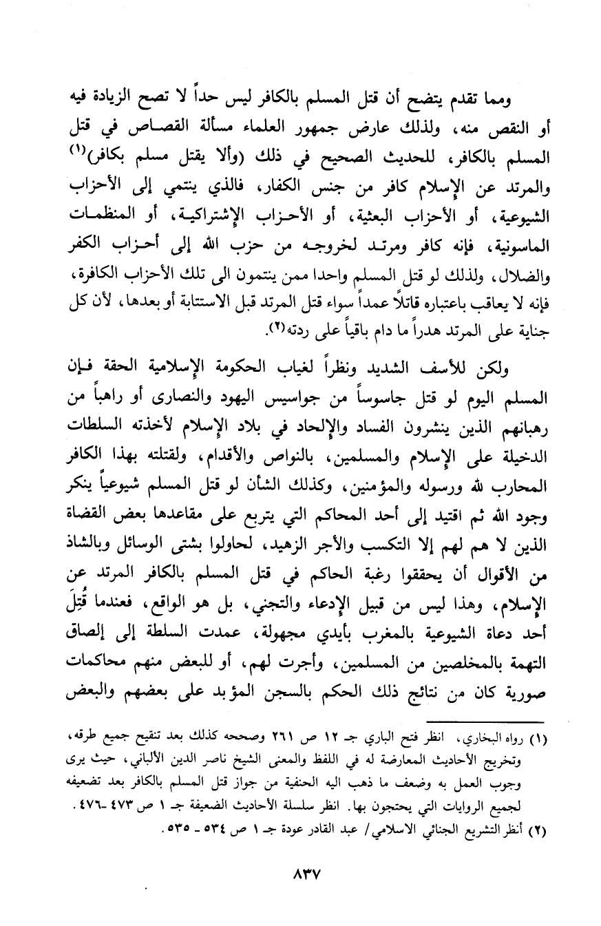 ومما تقدم يتضح أن قتل المسلم بالكافر ليس حدًا لا تصح الزيادة فيه أو النقص منه، ولذلك عارض جمهور العلماء مسألة القصاص في قتل المسلم بالكافر، للحديث الصحيح في ذلك «وألا يقتل مسلم بكافر» (¬1) والمرتد عن الإسلام كافر من جنس الكفار، فالذي ينتمي إلى الأحزاب الشيوعية، أو الأحزاب البعثية، أو الأحزاب الاشتراكية، أو المنظمات الماسونية، فإنه كافر ومرتد لخروجه من حزب الله إلى أحزاب الكفر والضلال، ولذلك لو قتل المسلم واحدًا ممن ينتمون إلى تلك الأحزاب الكافرة، فإنه لا يعاقب باعتباره قاتلاً عمدًا سواء قتل المرتد قبل الاستتابة أو بعدها، لأن كل جناية على المرتد هدرًا ما دام باقيًا على ردته (¬2).