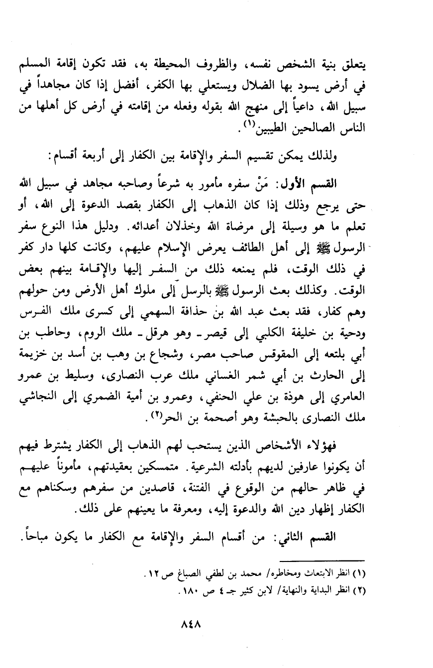 القسم الأول: مَنْ سفره مأمور به شرعًا وصاحبه مجاهد في سبيل الله حتى يرجع وذلك إذا كان الذهاب إلى الكفار بقصد الدعوة إلى الله، أو تعلم ما هو وسيلة إلى مرضاة الله وخذلان أعدائه. ودليل هذا النوع سفر الرسول - صلى الله عليه وسلم - إلى أهل الطائف يعرض الإسلام عليهم، وكانت كلها دار كفر في ذلك الوقت، فلم يمنعه ذلك من السفر إليها والإقامة بينهم بعض الوقت. وكذلك بعث الرسول - صلى الله عليه وسلم - بالرسل إلى ملوك أهل الأرض ومن حولهم وهم كفار، فقد بعث عبد الله بن حذافة السهمي إلى كسرى ملك الفرس ودحية بن خليفة الكلبي إلى قيصر - وهو هرقل - ملك الروم، وحاطب بن أبي بلتعة إلى المقوقس صاحب مصر، وشجاع بن وهب بن أسد بن خزيمة إلى الحارث بن أبي شمر الغساني ملك عرب النصارى، وسليط بن عمرو العامري إلى هوذة بن علي الحنفي، وعمرو بن أمية الضمري إلى النجاشي ملك النصارى بالحبشة وهو أصحمة بن الحر (¬2).