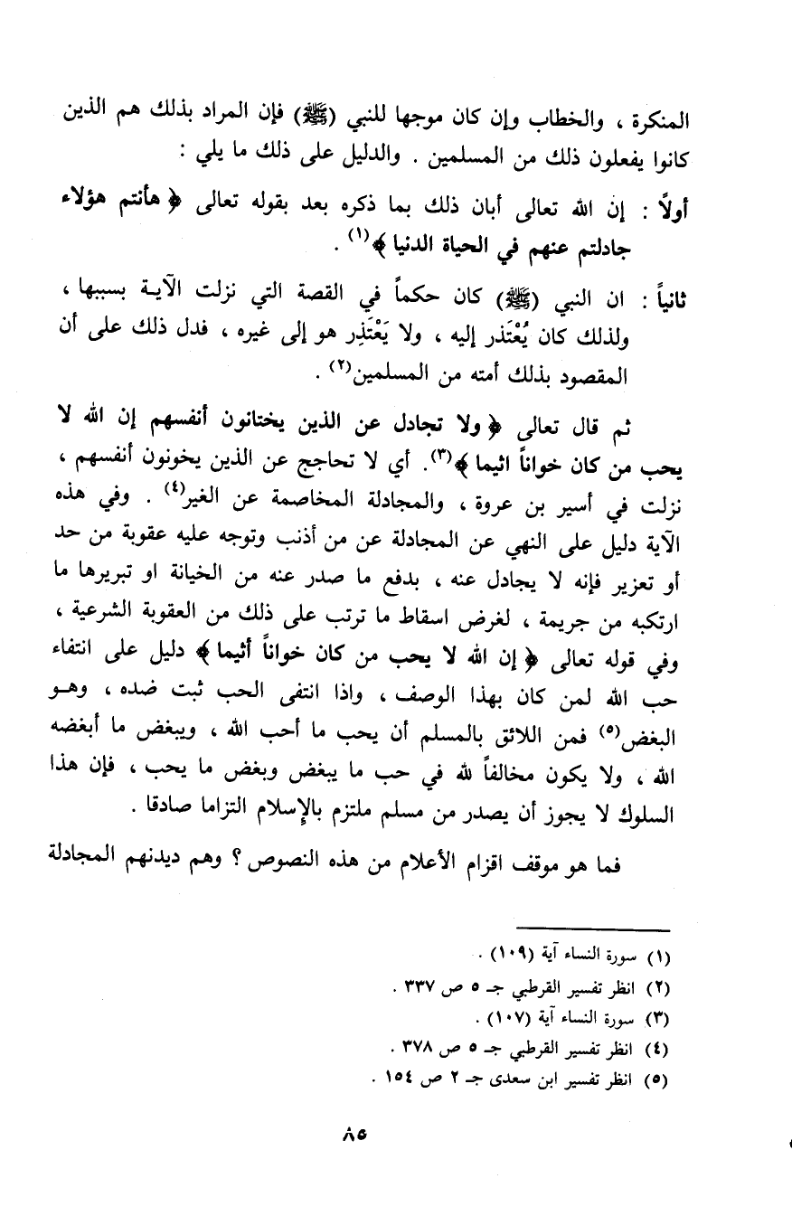 ثم قال تعالى: (وَلا تُجَادِلْ عَنِ الَّذِينَ يَخْتَانُونَ أَنْفُسَهُمْ إِنَّ اللهَ لا يُحِبُّ مَنْ كَانَ خَوَّانًا أَثِيمًا) [النساء: 107] أي لا تحاجج عن الذين يخونون أنفسهم، نزلت في «أسير بن عروة»، والمجادلة المخاصمة عن الغير (¬2)، وفي هذه الآية دليل على النهي عن المجادلة عن من أذنب وتوجه عليه عقوبة من حد أو تعزير فإنه لا يجادل عنه، بدفع ما صدر عنه من الخيانة أو تبرير ما ارتكبه من جريمة لغرض إسقاط ما ترتب على ذلك من العقوبة الشرعية، وفي قوله تعالى: (إِنَّ اللهَ لا يُحِبُّ مَنْ كَانَ خَوَّانًا أَثِيمًا) دليل على انتفاء حب الله لمن كان بهذا الوصف، وإذا انتفى الحب ثبت ضده وهو البغض (¬3) فمن اللائق بالمسلم أن يحب ما أحب الله، ويبغض ما أبغضه الله، ولا يكون مخالفا لله في حب ما يبغض وبغض ما يحب، فإن هذا السلوك لا يجوز أن يصدر من مسلم ملتزم بالإسلام التزاما صادقا.