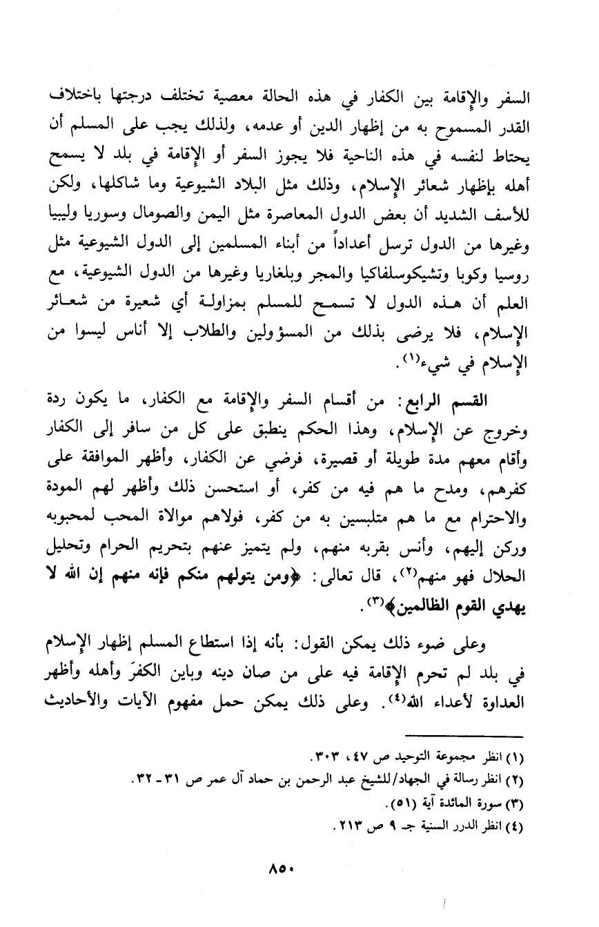 القسم الرابع: من أقسام السفر والإقامة مع الكفار، ما يكون ردة وخروج عن الإسلام، وهذا الحكم ينطبق على كل من سافر إلى الكفار وأقام معهم مدة طويلة أو قصيرة، فرضي عن الكفار، وأظهر الموافقة على كفرهم، ومدح ما هم فيه من كفر، أو استحسن ذلك وأظهر لهم المودة والاحترام مع ما هم متلبسين به من كفر، فولاهم موالاة المحب لمحبوبه وركن إليهم، وأنس بقربه منهم، ولم يتميز عنهم بتحريم الحرام وتحليل الحلال فهو منهم (¬2)، قال تعالى: (وَمَنْ يَتَوَلَّهُمْ مِنْكُمْ فَإِنَّهُ مِنْهُمْ إِنَّ اللَّهَ لَا يَهْدِي الْقَوْمَ الظَّالِمِينَ) (¬3).