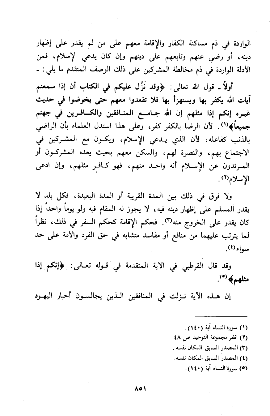 أولاً- قول الله تعالى: (وَقَدْ نَزَّلَ عَلَيْكُمْ فِي الْكِتَابِ أَنْ إِذَا سَمِعْتُمْ آَيَاتِ اللَّهِ يُكْفَرُ بِهَا وَيُسْتَهْزَأُ بِهَا فَلَا تَقْعُدُوا مَعَهُمْ حَتَّى يَخُوضُوا فِي حَدِيثٍ غَيْرِهِ إِنَّكُمْ إِذًا مِثْلُهُمْ إِنَّ اللَّهَ جَامِعُ الْمُنَافِقِينَ وَالْكَافِرِينَ فِي جَهَنَّمَ جَمِيعًا) (¬1). لأن الرضا بالكفر كفر، وعلى هذا استدل العلماء بأن الراضي بالذنب كفاعله، لأن الذي يدعي الإسلام، ويكون مع المشركين في الاجتماع بهم، والنصرة لهم، والسكن معهم بحيث يعده المشركون أو المرتدون عن الإسلام أنه واحد منهم، فهو كافر مثلهم، وإن ادعى الإسلام (¬2).