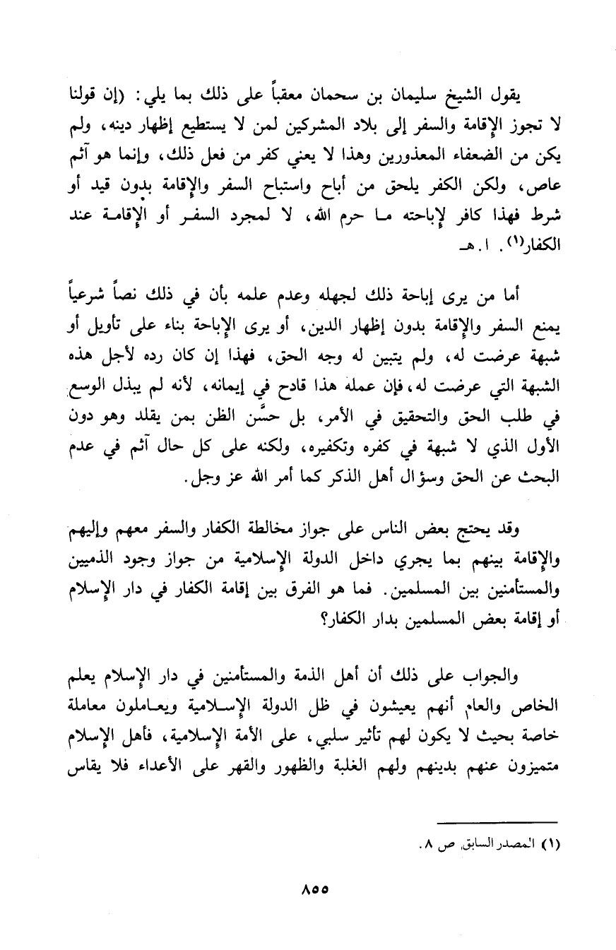 يقول الشيخ سليمان بن سحمان معقبًا على ذلك بما يلي: «إن قولنا لا تجوز الإقامة والسفر إلى بلاد المشركين لمن لا يستطيع إظهار دينه، ولم يكن من الضعفاء المعذورين وهذا لا يعني كفر من فعل ذلك، وإنما هو آثم عاص، ولكن يلحق من أباح واستباح السفر والإقامة بدون قيد أو شرط فهذا كافر لإباحته ما حرم، الله، لا لمجرد السفر أو الإقامة عند الكفار» (¬1). اهـ.
