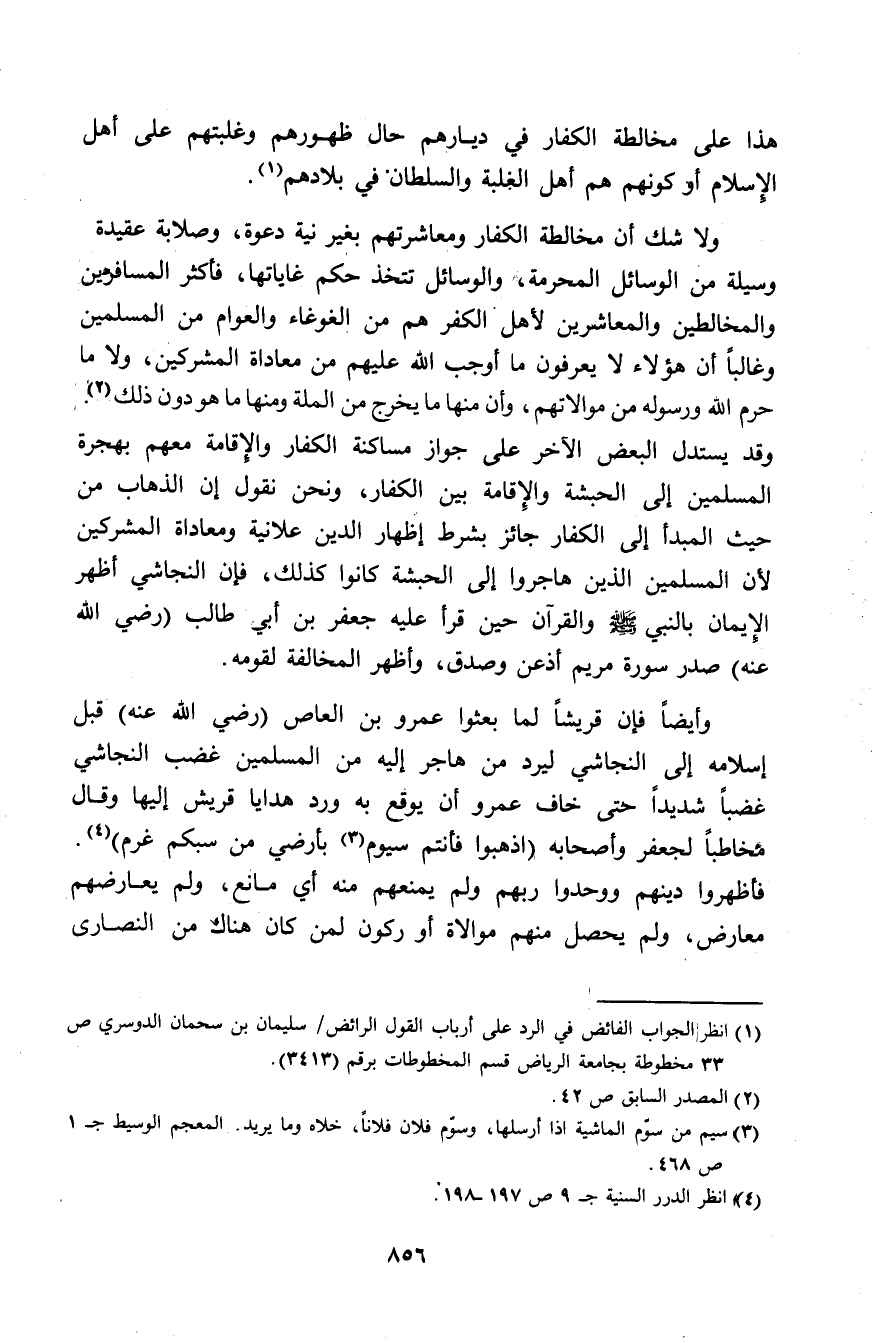 ولا شك أن مخالطة الكفار ومعاشرتهم بغير نية دعوة، وصلابة عقيدة وسيلة من الوسائل المحرمة، والوسائل تتخذ حكم غاياتها، فأكثر المسافرين والمخالطين والمعاشرين لأهل الكفر هم من الغوغاء والعوام من المسلمين وغالبًا أن هؤلاء لا يعرفون ما أوجب الله عليهم من معاداة المشركين، ولا ما حرم الله ورسوله من موالاتهم، وأن منها ما يخرج من الملة ومنها ما هو دون ذلك (¬2). وقد يستدل البعض الآخر على جواز مساكنة الكفار والإقامة معهم بهجرة المسلمين إلى الحبشة والإقامة بين الكفار، ونحن نقول إن الذهاب من حيث المبدأ إلى الكفار جائز بشرط إظهار الدين علانية ومعاداة المشركين لأن المسلمين الذين هاجروا إلى الحبشة كانوا كذلك، فإن النجاشي أظهر الإيمان بالنبي - صلى الله عليه وسلم - والقرآن حين قرأ عليه جعفر بن أبي طالب (رضي الله عنه) صدر سورة مريم أذعن وصدق، وأظهر المخالفة لقومه.