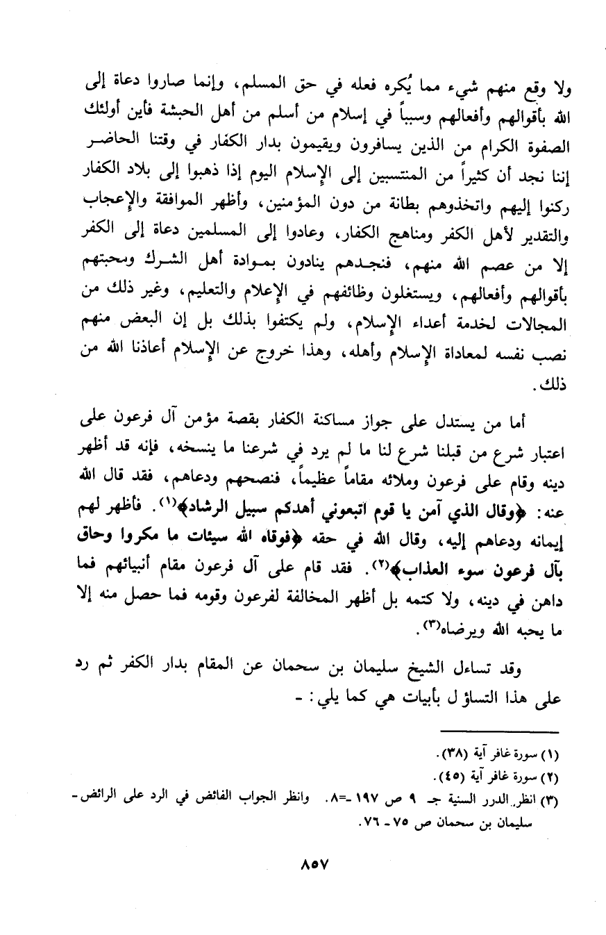 وقد تساءل الشيخ سليمان بن سحمان عن المقام بدار الكفر ثم رد على هذا التساؤل بأبيات هي كما يلي:-