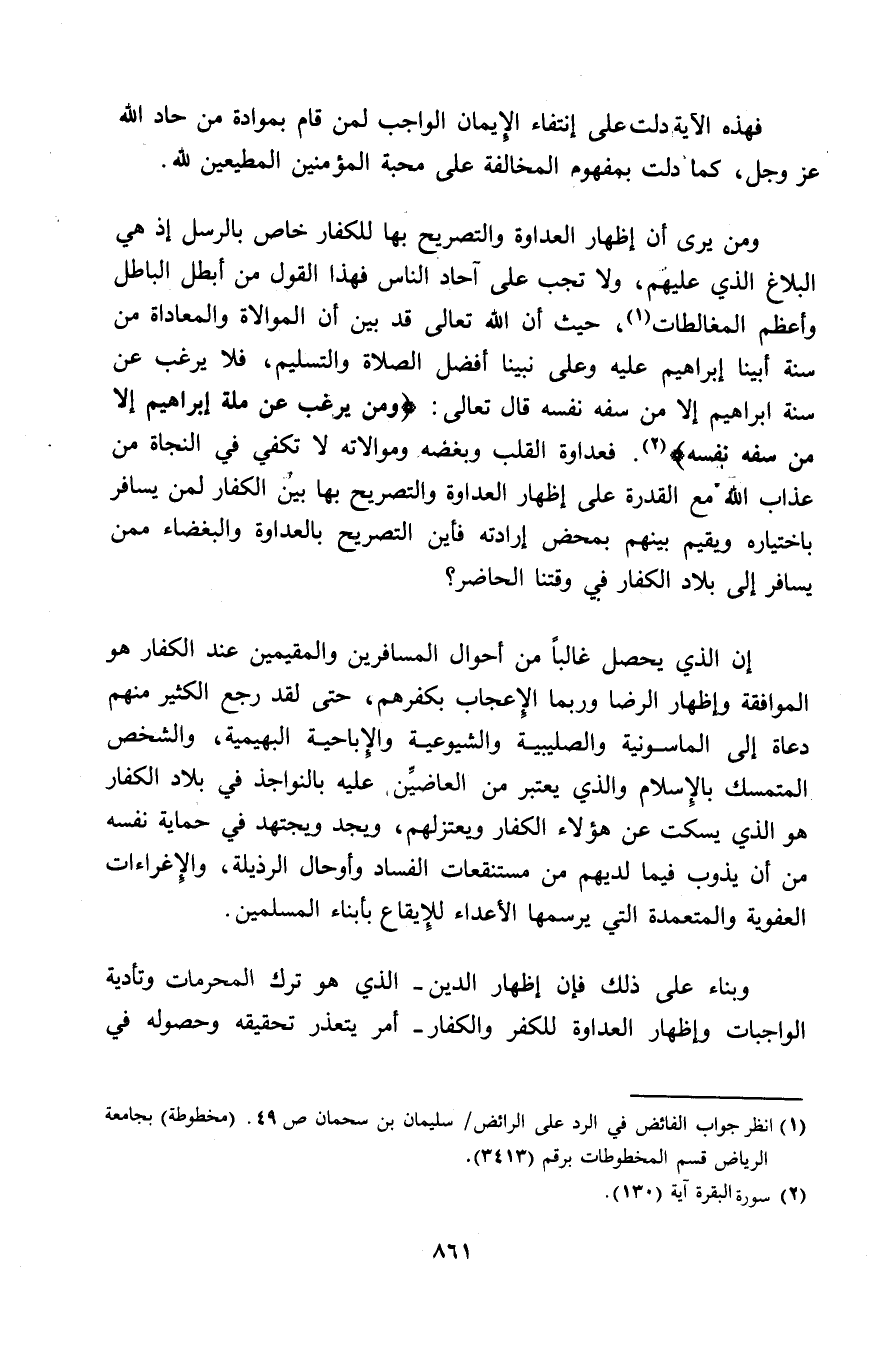 ومن يرى أن إظهار العداوة والتصريح بها للكفار خاص بالرسل إذ هي البلاغ الذي عليهم، ولا تجب على آحاد الناس فهذا القول من أبطل الباطل وأعظم المغالطات (¬1)، حيث إن الله تعالى قد بين أن الموالاة والمعاداة من سنة أبينا إبراهيم عليه وعلى نبينا أفضل الصلاة والتسليم، فلا يرغب عن سنة إبراهيم إلا من سفه نفسه قال تعالى: (وَمَنْ يَرْغَبُ عَنْ مِلَّةِ إِبْرَاهِيمَ إِلَّا مَنْ سَفِهَ نَفْسَهُ) (¬2). فعداوة القلب وبغضه وموالاته لا تكفي في النجاة من عذاب الله مع القدرة على إظهار العداوة والتصريح بها بين الكفار لمن يسافر باختياره ويقيم بينهم بمحض إرادته فأين التصريح بالعداوة والبغضاء ممن يسافر إلى بلاد الكفار في وقتنا الحاضر؟