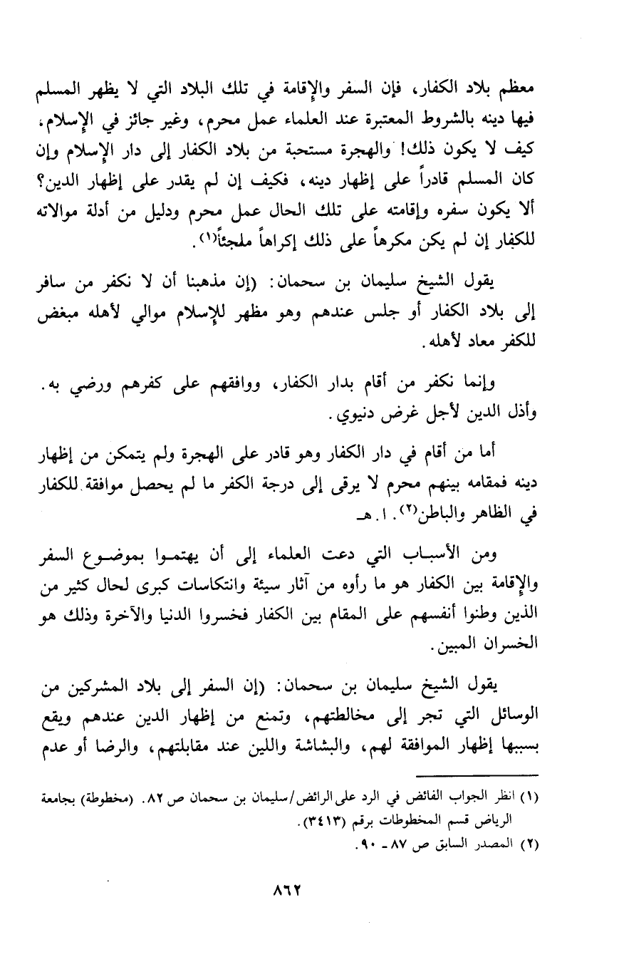 يقول الشيخ سليمان بن سحمان: «إن مذهبنا أن لا نكفر من سافر إلى بلاد الكفار أو جلس عندهم وهو مظهر للإسلام موالي لأهله مبغض للكفر معاد لأهله.