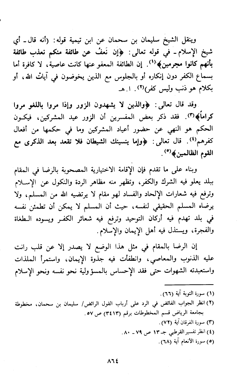 وينقل الشيخ سليمان بن سحمان عن ابن تيمية قوله: «أنه قال -أي شيخ الإسلام- في قوله تعالى: (إِنْ نَعْفُ عَنْ طَائِفَةٍ مِنْكُمْ نُعَذِّبْ طَائِفَةً بِأَنَّهُمْ كَانُوا مُجْرِمِينَ) (¬1). إن الطائفة المعفو عنها كانت عاصية، لا كافرة إما بسماع الكفر دون إنكاره أو بالجلوس مع الذين يخوضون في آيات الله، أو بكلام هو ذنب وليس كفر» (¬2) اهـ.