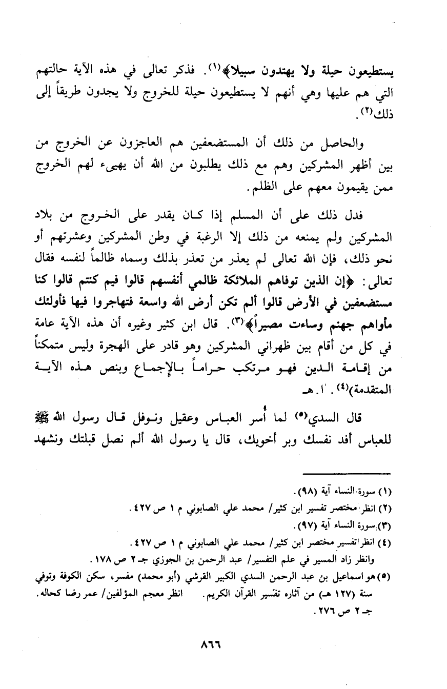 فدل ذلك على أن المسلم إذا كان يقدر على الخروج من بلاد المشركين ولم يمنعه من ذلك إلا الرغبة في وطن المشركين وعشرتهم أو نحو ذلك، فإن الله تعالى لم يعذر من تعذر بذلك وسماه ظالمًا لنفسه فقال تعالى: (إِنَّ الَّذِينَ تَوَفَّاهُمُ الْمَلَائِكَةُ ظَالِمِي أَنْفُسِهِمْ قَالُوا فِيمَ كُنْتُمْ قَالُوا كُنَّا مُسْتَضْعَفِينَ فِي الْأَرْضِ قَالُوا أَلَمْ تَكُنْ أَرْضُ اللَّهِ وَاسِعَةً فَتُهَاجِرُوا فِيهَا فَأُولَئِكَ مَأْوَاهُمْ جَهَنَّمُ وَسَاءَتْ مَصِيرًا) (¬3). قال ابن كثير وغيره: إن هذه الآية عامة في كل من أقام بين ظهراني المشركين وهو قادر على الهجرة وليس متمكنًا من إقامة الدين فهو مرتكب حرامًا بالإجماع وبنص هذه الآية المتقدمة (¬4). اهـ.