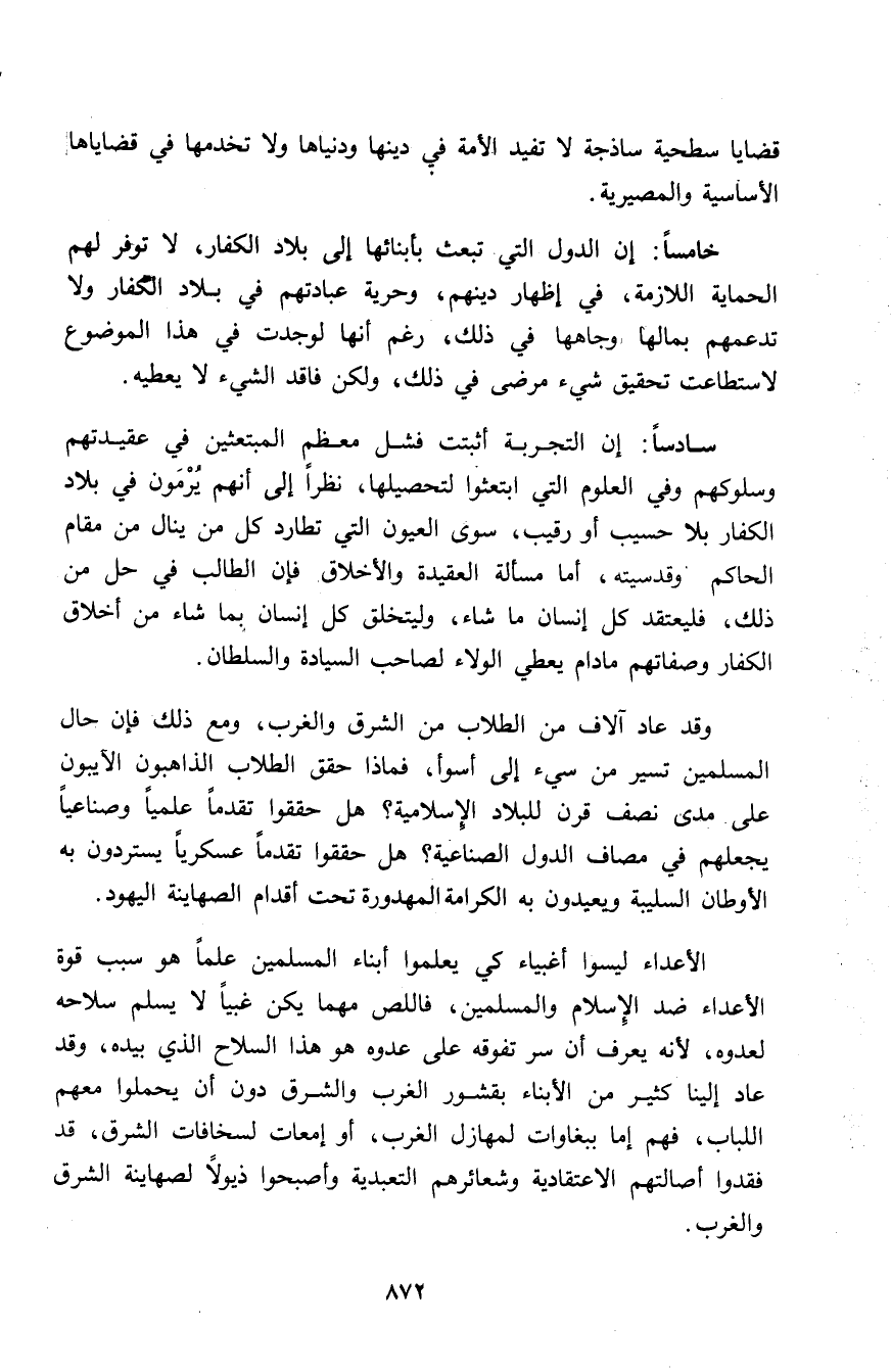 وقد عاد آلاف من الطلاب من الشرق والغرب، ومع ذلك فإن حال المسلمين تسير من سيء إلى أسوأ، فماذا حقق الطلاب الذاهبون الآيبون على مدى نصف قرن للبلاد الإسلامية؟ هل حققوا تقدمًا عسكريًا يستردون به الأوطان السليبة ويعيدون به الكرامة المهدورة تحت أقدام الصهاينة اليهود.