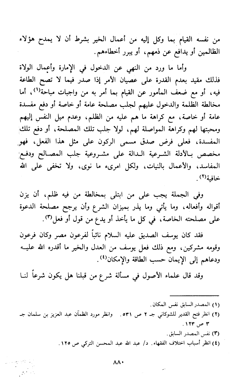 وأما ما ورد من النهي عن الدخول في الإمارة وأعمال الولاة فذلك مقيد بعدم القدرة على عصيان الأمر إذا صدر فيما لا تصح الطاعة فيه، أو مع ضعف المأمور عن القيام بما أمر به من واجبات مباحة (¬1)، أما مخالطة الظلمة والدخول عليهم لجلب مصلحة عامة أو خاصة أو دفع مفسدة عامة أو خاصة، مع كراهة ما هم عليه من الظلم، وعدم ميل النفس إليهم ومحبتها لهم وكراهة المواصلة لهم، لولا جلب تلك المصلحة، أو دفع تلك المفسدة، فعلى فرض صدق مسمى الركون على مثل هذا الفعل، فهو مخصص بالأدلة الشرعية الدالة على مشروعية جلب المصالح ودفع المفاسد، والأعمال بالنيات، ولكل امرئ ما نوى، ولا تخفى على الله خافية (¬2).