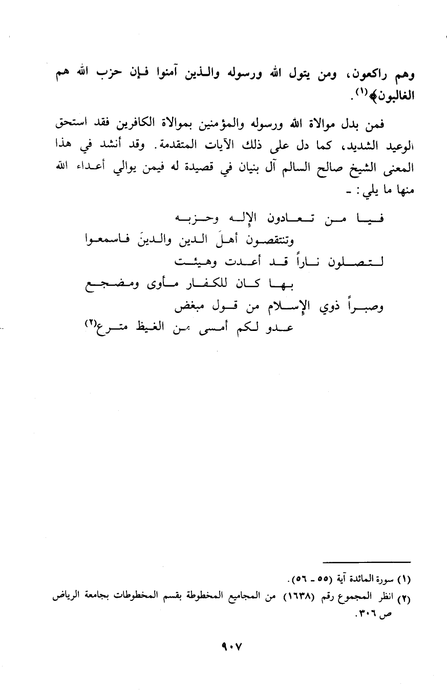 فمن بدَّل موالاة الله ورسوله والمؤمنين بموالاة الكافرين فقد استحق الوعيد الشديد، كما دل على ذلك الآيات المتقدمة. وقد أنشد في هذا المعنى الشيخ صالح السالم آل بنيان في قصيدة له فيمن يوالي أعداء الله منها ما يلي:-