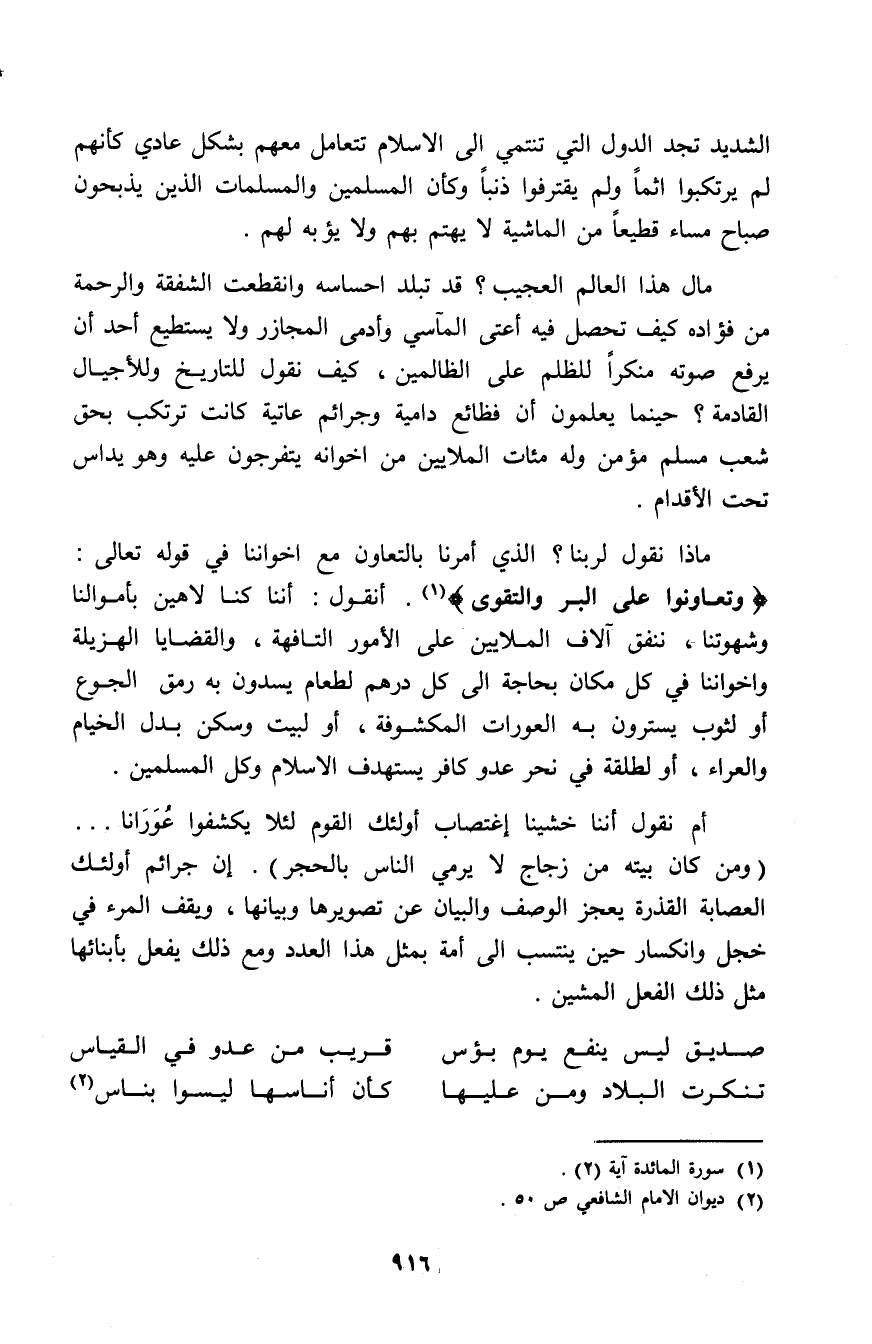 مال هذا العالم العجيب؟ قد تبلد إحساسه وانقطعت الشفقة والرحمة من فؤاده كيف تحصل فيه أعتى المآسي وأدمى المجازر ولا يستطيع أحد أن يرفع صوته منكرًا للظلم على الظالمين؟ ماذا نقول للتاريخ وللأجيال القادمة؟ حينما يعلمون أن فظائع دامية وجرائم عاتية كانت ترتكب بحق شعب مسلم مؤمن وله مئات الملايين من إخوانه يتفرجون عليه وهو يداس تحت الأقدام.