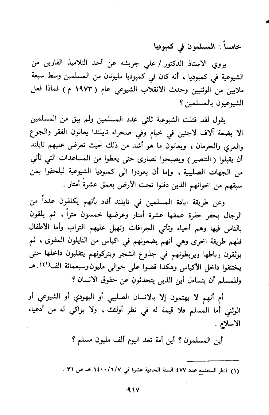 يقول: لقد قتلت الشيوعية ثلثي عدد المسلمين ولم يبق من المسلمين إلا بضعة آلاف لاجئين في خيام وفي صحراء تايلند يعانون الفقر والجوع والعري والحرمان، ويعانون ما هو أشد من ذلك حيث تعرض عليهم تايلند أن يقبلوا (التنصير) ويصبحوا نصارى حتى يعطوا من المساعدات التي تأتي من الجهات الصليبية، وإما أن يعودوا إلى كمبوديا الشيوعية ليلحقوا بمن سبقهم من إخوانهم الذين دفنوا تحت الأرض بعمق عشرة أمتار.