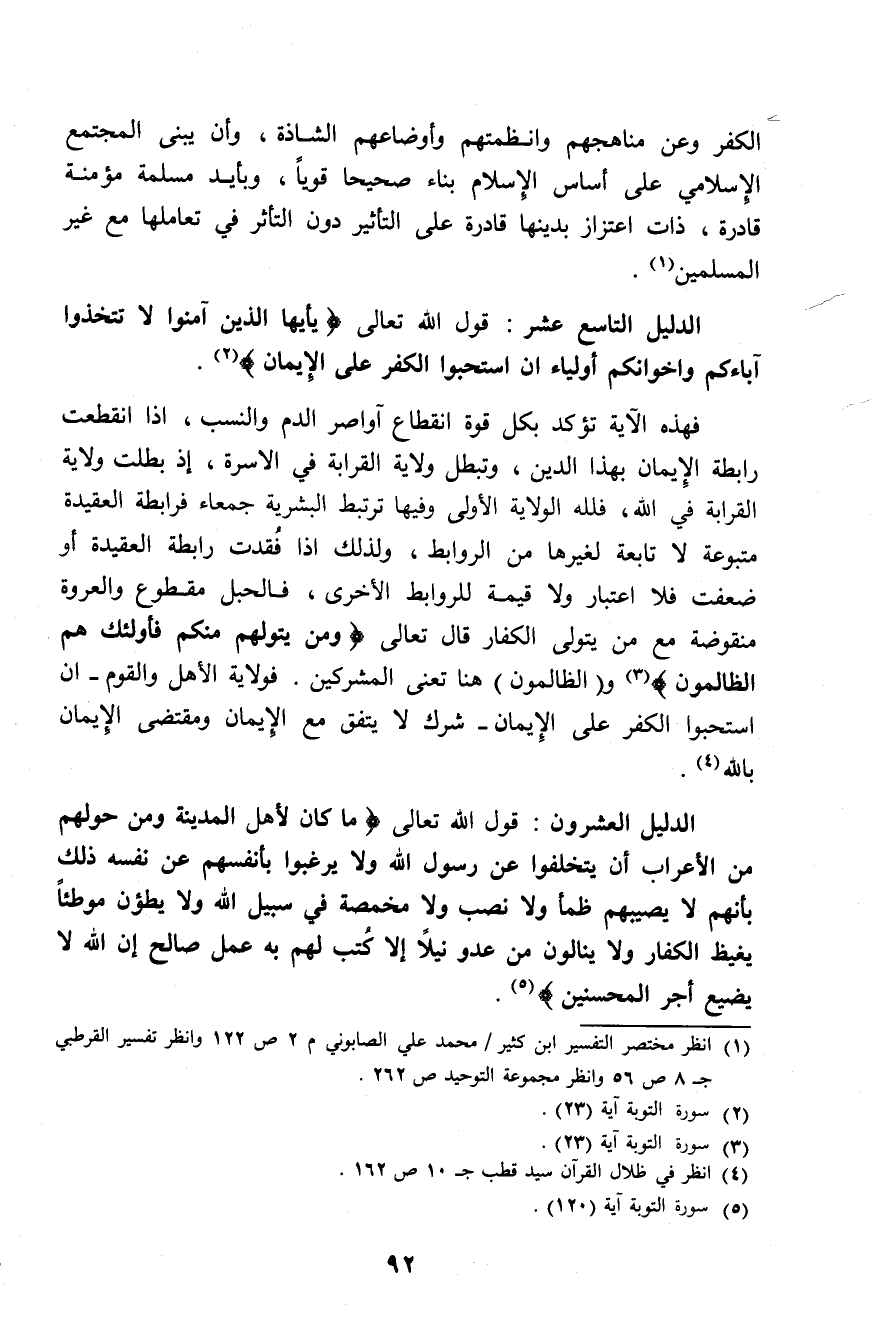 الدليل التاسع عشر: قول الله تعالى: (يَا أَيُّهَا الَّذِينَ آمَنُوا لا تَتَّخِذُوا آبَاءَكُمْ وَإِخْوَانَكُمْ أَوْلِيَاءَ إِنِ اسْتَحَبُّوا الْكُفْرَ عَلَى الإِيمَانِ) [التوبة: 23].