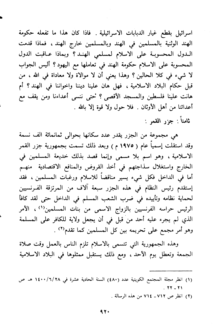 إسرائيل بقطع غيار الدبابات الإسرائيلية. فإذا كان هذا ما تفعله حكومة الهند الوثنية بالمسلمين في الهند وبالمسلمين خارج الهند، فماذا قدمت الدول المحسوبة على الإسلام لمسلمي الهند؟ بماذا عاقبت الدول المحسوبة على الإسلام حكومة الهند في تعاملها مع اليهود؟ أليس الجواب لا شيء في كلا الحالين؟ وهذا يعني أن لا موالاة ولا معاداة في الله، من قبل حكام البلاد الإسلامية، فهل هان علينا ديننا وإخواننا في الهند؟ أم هانت علينا فلسطين والمسجد الأقصى؟ حتى ننسى أعداءنا ومن يقف مع أعدائنا من أهل الأوثان. فلا حول ولا قوة إلا بالله.