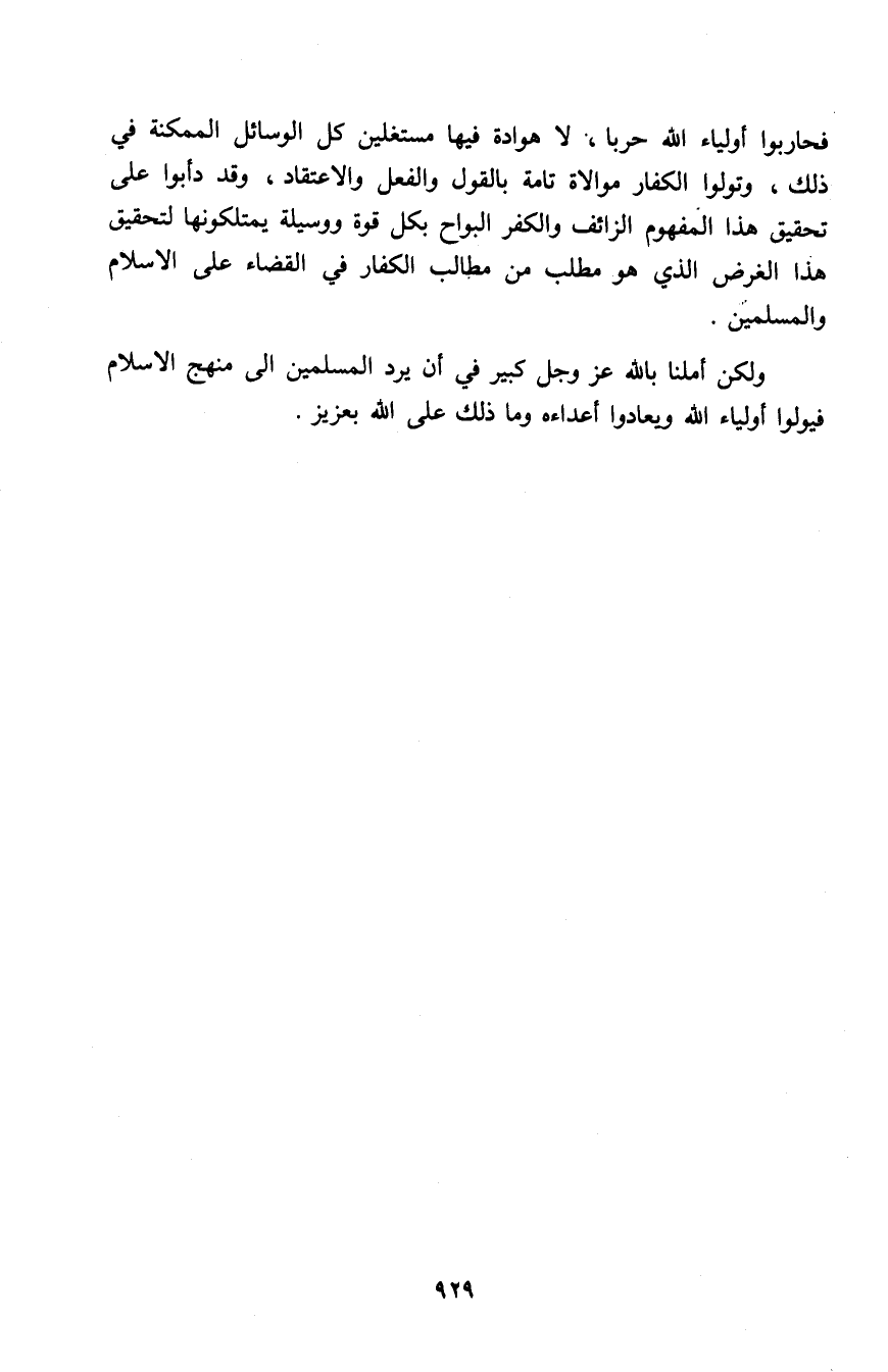 فحاربوا أولياء الله حربًا، لا هوادة فيها مستغلين كل الوسائل الممكنة في ذلك، وتولوا الكفار موالاة تامة بالقول والفعل والاعتقاد، وقد دأبوا على تحقيق هذا المفهوم الزائف والكفر البواح بكل قوة ووسيلة يمتلكونها لتحقيق هذا الغرض الذي هو مطلب من مطالب الكفار في القضاء على الإسلام والمسلمين».