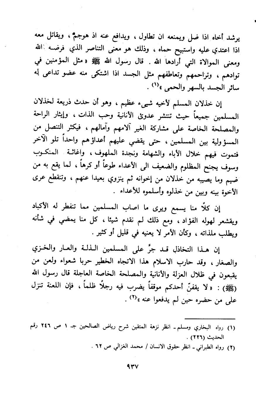 يرشد أخاه إذا ضل ويمنعه إن تطاول، ويدافع عنه إذ هوجم، ويقاتل معه إذا اعتدي عليه واستبيح حماه، وذلك هو معنى التناصر الذي فرضه الله ومعنى الموالاة التي أرادها الله. قال رسول الله - صلى الله عليه وسلم - «مثل المؤمنين في توادهم، وتراحمهم وتعاطفهم مثل الجسد إذا اشتكى منع عضو تداعى له سائر الجسد بالسهر والحمى» (¬1).