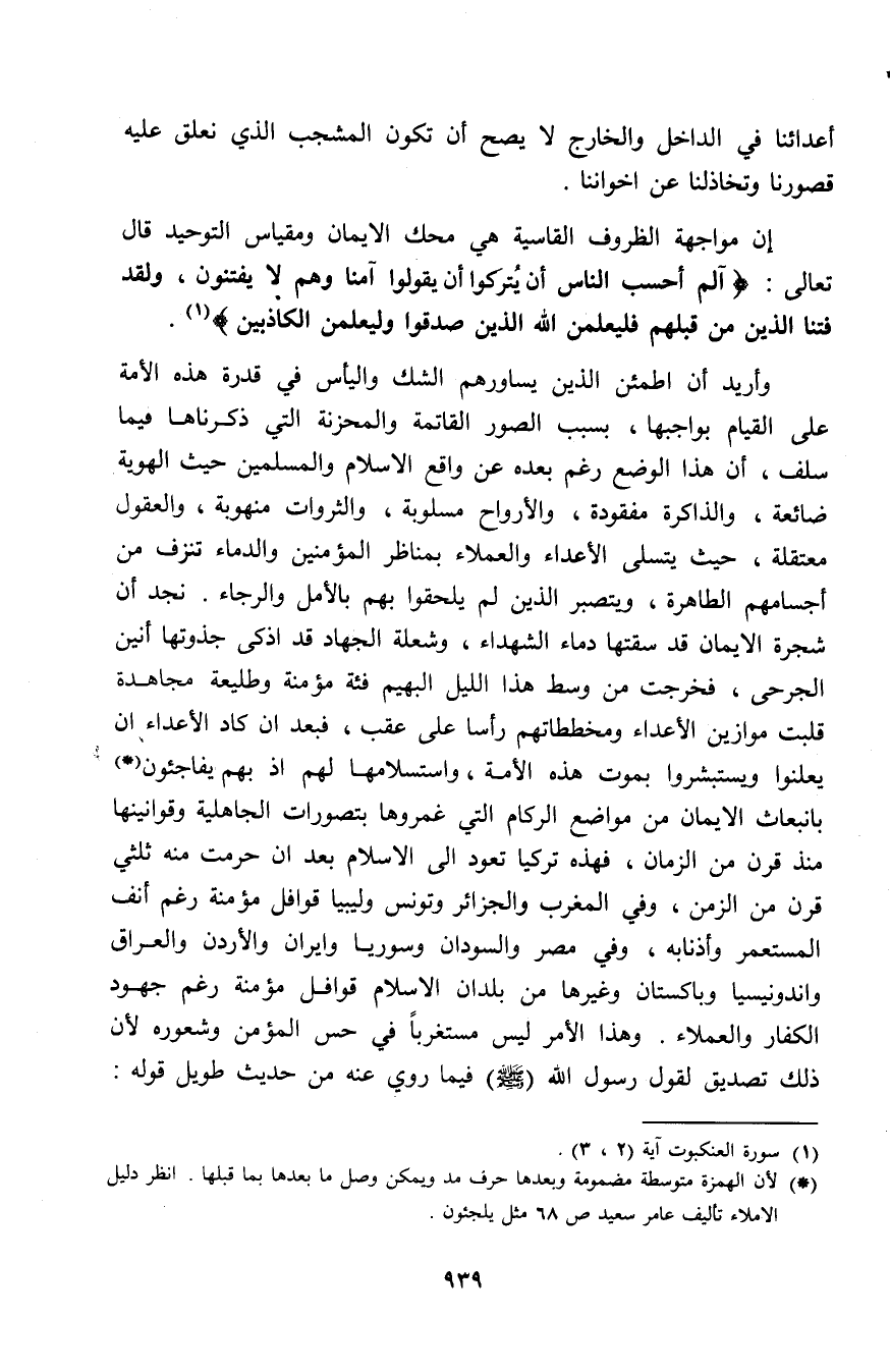 وأريد أن أطمئن الذين يساورهم الشك واليأس في قدرة هذه الأمة على القيام بواجبها، بسب الصور القاتمة والمحزنة التي ذكرناها فيما سلف، أن هذا الوضع رغم بعده عن واقع الإسلام والمسلمين حيث الهوية ضائعة، والذاكرة مفقودة، والأرواح مسلوبة، والثروات منهوبة، والعقول معتقلة، حيث يتسلى الأعداء والعملاء بمناظر المؤمنين والدماء تنزف من أجسامهم الطاهرة، ويتصبر الذين لم يلحقوا بهم بالأمل والرجاء، نجد أن شجرة الإيمان قد سقتها دماء الشهداء، وشعلة الجهاد قد أذكى جذوتها أنين الجرحى، فخرجت من وسط هذه الليل البهيم فئة مؤمنة وطليعة مجاهدة قلبت موازين الأعداء ومخططاتهم رأسًا على عقب، فبعد أن كاد الأعداء أن يعلنوا ويستبشروا بموت هذه الأمة، واستسلامها لهم إذ بهم يفاجئون (¬2) بانبعاث الإيمان من مواضع الركام التي غمروها بتصورات الجاهلية وقوانينها منذ قرن من الزمان، فهذه تركيا تعود إلى الإسلام بعد أن حرمت منه ثلثي قرن من الزمن، وفي المغرب والجزائر وتونس وليبيا قوافل مؤمنة رغم أنف المستعمر وأذنابه، وفي مصر والسودان وسوريا وإيران والأردن والعراق وأندونيسيا وباكستان وغيرها من بلدان الإسلام قوافل مؤمنة رغم جهود الكفار والعملاء. وهذا الأمر ليس مستغربًا في حس المؤمن وشعوره لأن ذلك تصديق لقول رسول الله - صلى الله عليه وسلم - فيما روي عنه من حديث طويل قوله: