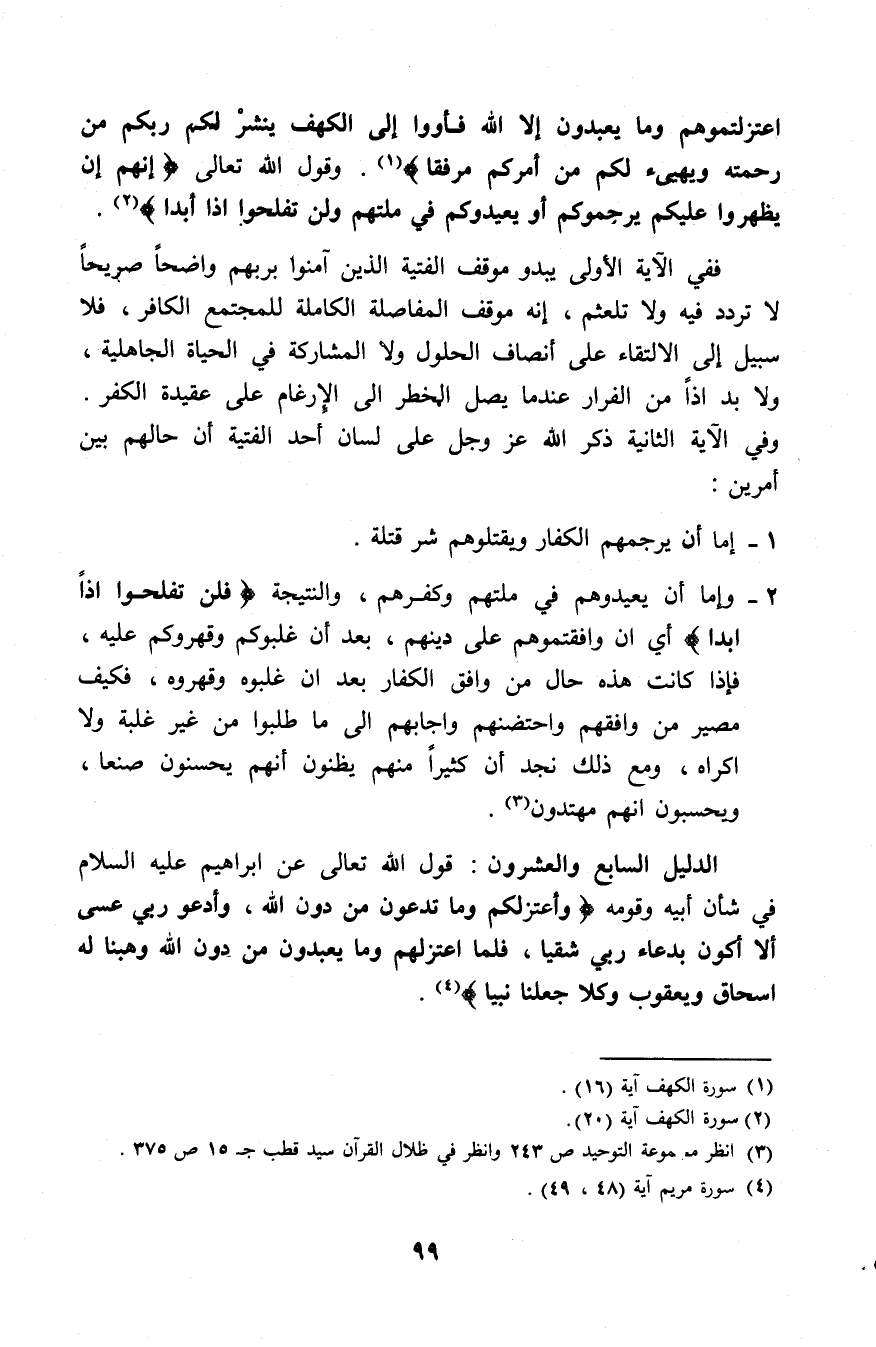 اعْتَزَلْتُمُوهُمْ وَمَا يَعْبُدُونَ إِلا اللهَ فَأْوُوا إِلَى الْكَهْفِ يَنْشُرْ لَكُمْ رَبُّكُمْ مِنْ رَحْمَتِهِ وَيُهَيِّئْ لَكُمْ مِنْ أَمْرِكُمْ مِرْفَقًا) [الكهف: 16] وقول الله تعالى: (إِنَّهُمْ إِنْ يَظْهَرُوا عَلَيْكُمْ يَرْجُمُوكُمْ أَوْ يُعِيدُوكُمْ فِي مِلَّتِهِمْ وَلَنْ تُفْلِحُوا إِذًا أَبَدًا) [الكهف: 20].
