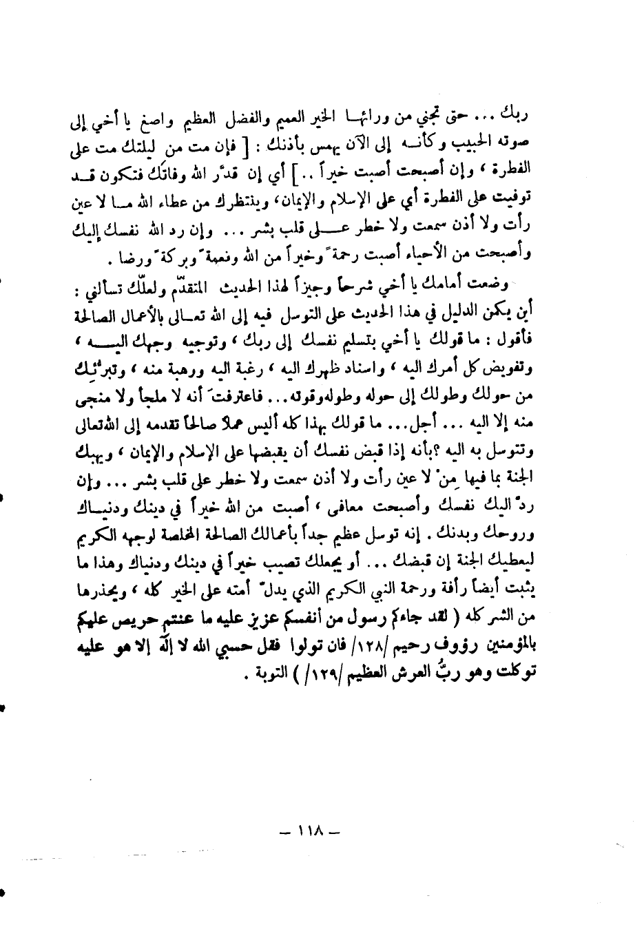 وضعت أمامك يا أخي شرحاً وجيزاً لهذا الحديث المتقدم ولعلك تسألني: أين يكمن الدليل في هذا الحديث على التوسل فيه إلى الله تعالى بالأعمال الصالحة فأقول: ما قولك بتسليم نفسك إلى ربك وتوجيه وجهك إليه وتفويض كل ما أمرك إليه وإسناد ظهرك إليه رغبة إليه ورهبة منه وتبرئك من حولك وطولك إلى حوله وطوله وقوته ... فاعترفت أنه لا ملجأ ولا ومنجى منه إلا إليه ... أجل ... ما قولك بهذا كله أليس عملاً صالحاً تقدمه إلى الله تعالى وتتوسل به إليه؟ بأنه إذا قبض نفسك أن يقبضها على الإسلام والإيمان ويهبك الجنة بما فيها من لا عين رأت ولا أذن سمعت ولا خطر على قلب بشر ... وإن رد إليك نفسك وأصبحت معافى أصبت من الله خيراً في دينك وديناك وروحك وبدنك إنه توسل عظيم جداً بأعمالك الصالحة المخلصة لوجهه الكريم ليعطيك الجنة إن قبضك ... أو يجعلك تصيب خيراً في دينك وديناك وهذا ما يثبت أيضاً رأفة ورحمة النبي الكريم الذي يدل أمته على الخير كله ويحذرها من الشر كله (لقد جاءكم رسول من أنفسكم عزيز عليه ما عنتم حريص عليكم بالمؤمنين رؤوف رحيم /128/ فإن تولوا فقل حسبي الله لا إله إلا هو عليه توكلت وهو رب العرش العظيم /129/) التوبة.
