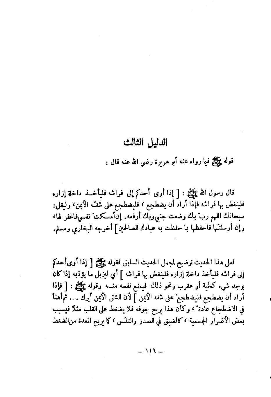 قال رسول الله - صلى الله عليه وسلم -: [إذا رأى أحدكم إلى فراشه فليأخذ داخله إزاره فلينفض بها فراشه فإذا أراد أن يضطجع فليضطجع على شقه الأيمن وليقل: سبحانك اللهم رب بك وضعت جنبي وبك أرفعه إن أمسكت نفسي فاغفر لها وإن أرسلتها فاحفظها بما حفظت به عبادك الصالحين] أخرجه البخاري ومسلم.