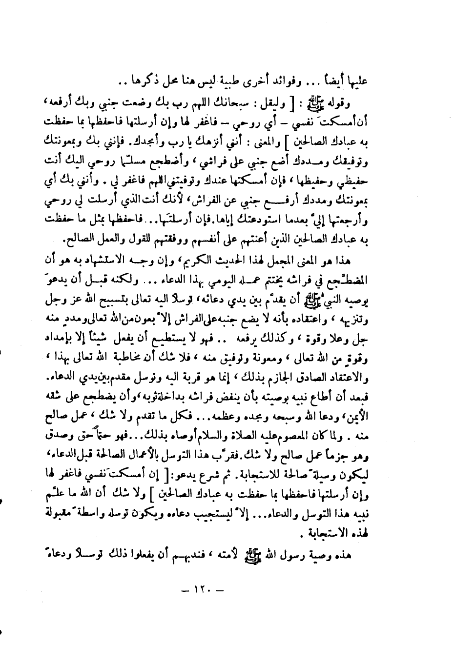 هذا هو المعنى المجمل لهذا الحديث الكريم وإن وجه الاستشهاد به هو أن المضطجع في فراشه يختتم عمله اليومي بهذا الدعاء ... ولكنه قبل أن يدعو يوصيه النبي - صلى الله عليه وسلم - أن يقدم بين يدي دعائه توسلاً إليه تعالي بتسبيح الله عز وجل وتنزيهه واعتقاده بأنه لا يضع جنبه على الفراش إلا بعون من الله تعالى ومدد منه جل وعلا وقوة وكذلك يرفعه .. فهو لا يستطيع أن يفعل شيئاً إلا بإمداد وقوة من الله الصادق ومعونة وتوفيق منه فلا شك أن مخاطبة الله تعالى بهذا والاعتقاد الصادق والجازم بذلك إنما هو قربة إليه وتوسل مقدم بين يدي الدعاء. فبعد أن أطاع نبيه بوصيته بأن ينفض فراشه بداخل ثوبه وأن يضطجع على شقه الأيمن ودعا الله وسبحه ومجده وعظمه ... فكل ما تقدم ولا شك عمل صالح منه ولما كان المعصوم عليه الصلاة والسلام أوصاه بذلك ... فهو حتماً حق وصدق وهو جزماً عمل صالح ولا شك فقرب هذا التوسل بالأعمال الصالحة قبل الدعاء ليكون وسيلة صالحة للاستجابة ثم شرع يدعو: [إن أمسكت نفسي فاغفر لها وإن أرسلتها فاحفظها بما حفظت به عبادك الصالحين] ولا شك أن الله ما علم نبيه هذا التوسل والدعاء ... إلا ليستجيب دعاءه ويكون توسله واسطة مقبولة لهذه الاستجابة.
