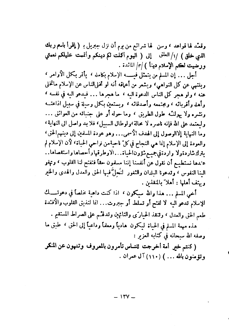 أجل ... إن المسلم من يتمثل فيه الإسلام بكامله، يأتمر يكل الأوامر وينتهي عن كل النواهي ويشعر من أعماقه أنه لو تخلى الناس عن الإسلام ما تخلى عنه ولو هجر كل الناس الدعوة إليه ما هجرها ... فيدعو إليه في نفسه وأهله وأقربائه ومجتمعه وأصدقائه ويستعين بكل وسيلة في سبيل إذاعته ونشره ولا يهولنه طول الطريق وما حوله أو على جنباته من العوائق ... وليعتمد على الله فإنه ناصره لا محالة ولو طال السبيل فلا بد واصل إلى النهاية وما النهاية إلا الوصول إلى الهدف الأسمى ... وهو عودة المسلمين إلى دينهم الحق والعودة إلى الإسلام إنما هي النجاح في كل ناحية من نواحي الحياة لأن الإسلام لم يترك شاردة ولا واردة في جميع شؤون الحياة ... إلا وطرقها وأحصاها واستقصاها .. عندما نستطيع أن نقول عن أنفسنا إننا مسلمون حقاً فتفتح لنا القلوب وتهفو الينا النفوس وتدعونا البلدان والثغور لنحل فيها الحق والعدل والهدى والخير ويهتف أهلها: أهلاً بالمنقذين.