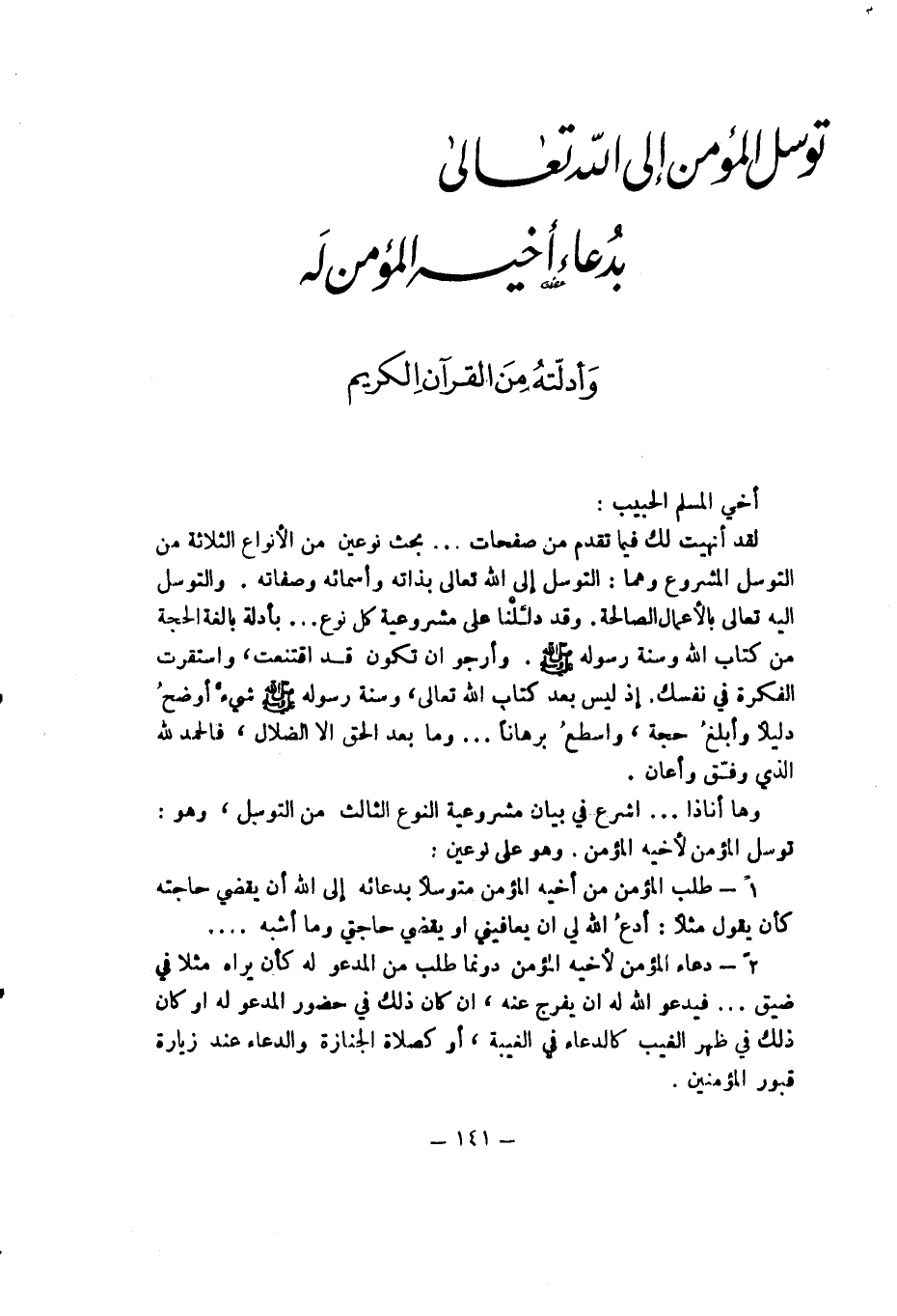 لقد أنهيت لك فيما تقدم من صفحات ... بحث نوعين من الأنواع الثلاثة من التوسل المشروع وهما: التوسل إلى الله تعالى بذاته وصفاته والتوسل إليه بالأعمال الصالحة وقد دللنا على مشروعية كل نوع ... بأدلة بالغة الحجة من كتاب الله وسنة رسوله - صلى الله عليه وسلم - وأرجو أن تكون قد اقتنعت واستقرت الفكرة في نفسك إذ ليس بعد كتاب الله تعالى وسنة رسوله - صلى الله عليه وسلم - شيء أوضح دليلاً وأبلغ حجة واسطع برهاناً ... وما بعد الحق إلا الضلال فالحمد الله الذي وفق وأعان.