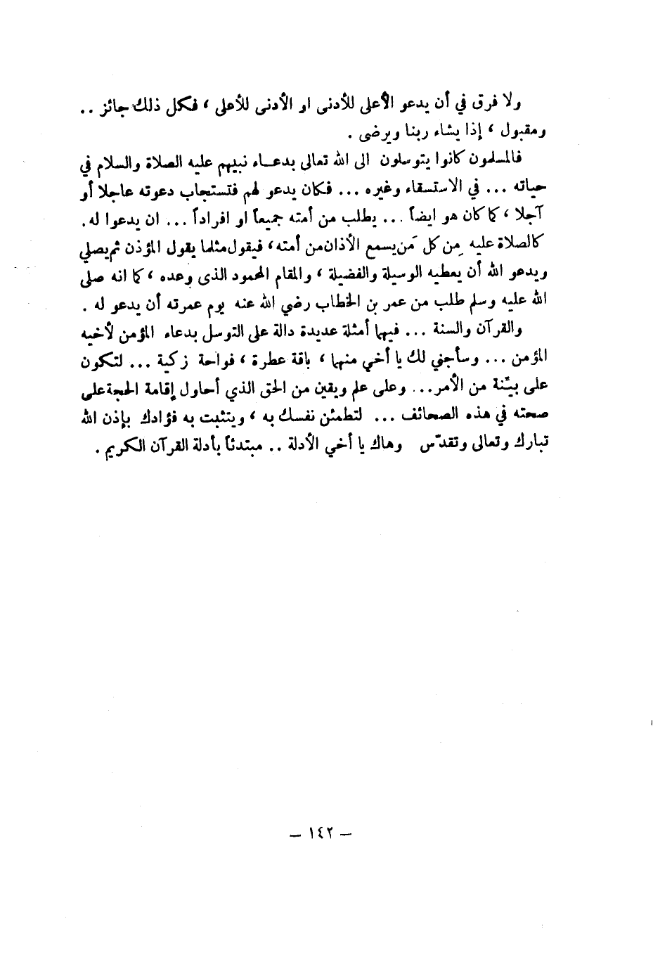 فالمسلمون كانوا يتوسلون إلى الله تعالى بدعاء نبيهم عليه الصلاة والسلام في حياته ... في الاستسقاء وغيره ... فكان يدعو لهم فتستجاب دعوته عاجلاً أو آجلاً كما كان هو أيضاً ... يطلب من أمته جميعاً أو أفراداً ... أن يدعوا له. كالصلاة عليه من كل من يسمع الأذان من أمته فيقول مثلماً يقول المؤذن ثم يصلي ويدعو الله أن يعطيه الوسيلة والفضيلة والمقام المحمود الذي وعده كما أنه صلى عليه وسلك طلب من عمر بن الخطاب - رضي الله عنه - يوم عمرته أن يدعو له.