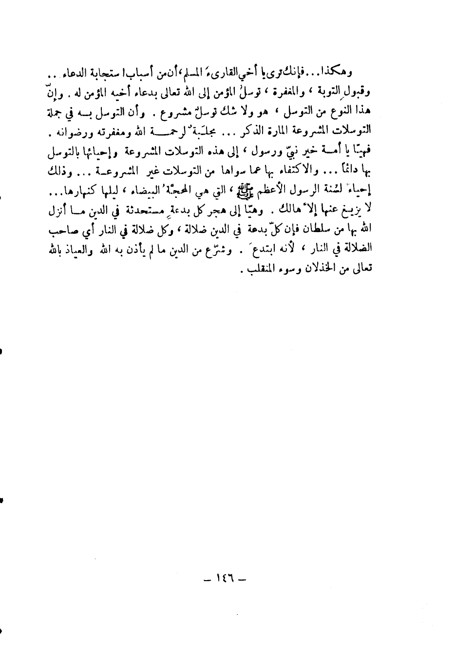 فهيا يا أمة خير نبي ورسول إلى هذه التوسلات المشروعة وإحيائها بالتوسل بها دائماً والاكتفاء بها عما سواها من التوسلات غير المشروعة ... وذلك إحياء لسنة الرسول الأعظم - صلى الله عليه وسلم - التي هي المحجة البيضاء ليلها كنهارها لا يزيغ عنها إلا هالك وهيا إلى هجر كل بدعة مستحدثة في الدين ما أنزل الله بها من سلطان فإن كل بدعة في الدين ضلالة وكل ضلالة في النار أي صاحب الضلالة في النار لأنه ابتدع وشرع من الدين ما لم يأذن به الله والعياذ بالله تعالى من الخذلان وسوء المنقلب.