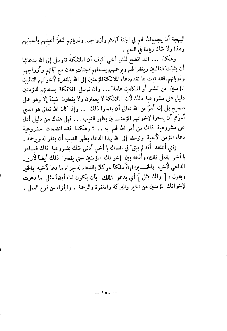 وهكذا ... فقد اتضح لك يا أخي كيف أن الملائكة تتوسل إلى الله دعائها أن يثبت التائبين ويغفر لهم ويرحمهم ويدخلهم جنات عدن مع آبائهم وأزواجهم وذرياتهم فقد ثبت بما تقدم دعاء الملائكة المؤمنين إلى الله بالمغفرة لإخوانهم التائبين المؤمنين من البشر أو المكلفين عامة وأن توسل الملائكة بدعائهم للمؤمنين دليل على مشروعية ذلك لأن الملائكة لا يعلمون ولا يفعلون شيئاً إلا وهو عمل صحيح بل إنه أمر من الله تعالى أن يفعلوا ذلك وإذا كان الله تعالى هو الذي أمرهم أن يدعوا لإخوانهم المؤمنين بظهر الغيب فهل هناك من دليل أدل على مشروعية ذلك من أمر الله لهم به ... ؟ وهكذا فقد اتضحت مشروعية دعاء المؤمن لأخيه وتوسله إلى الله بهذا الدعاء بظهر الغيب أن يغفر له ويرحمه إنني أعتقد أنه لم يبق في نفسك يا أخي أدنى شك بمشروعية ذلك فبادر يا أخي بفعل ذلك وأذعه بين إخوانك المؤمنين حتى يفعلوا ذلك أيضاً لأن الداعي لأخيه بالخير فإن ملكاً موكلاً بالدعاء له جزاء ما دعا لأخيه بالخير ويقول: [ولك بمثل] أي يدعو الملك بأن يكون لك أيضاً مثل ما دعوت لإخوانك المؤمنين من الخير والبركة والمغفرة والرحمة. والجزاء من نوع العمل.