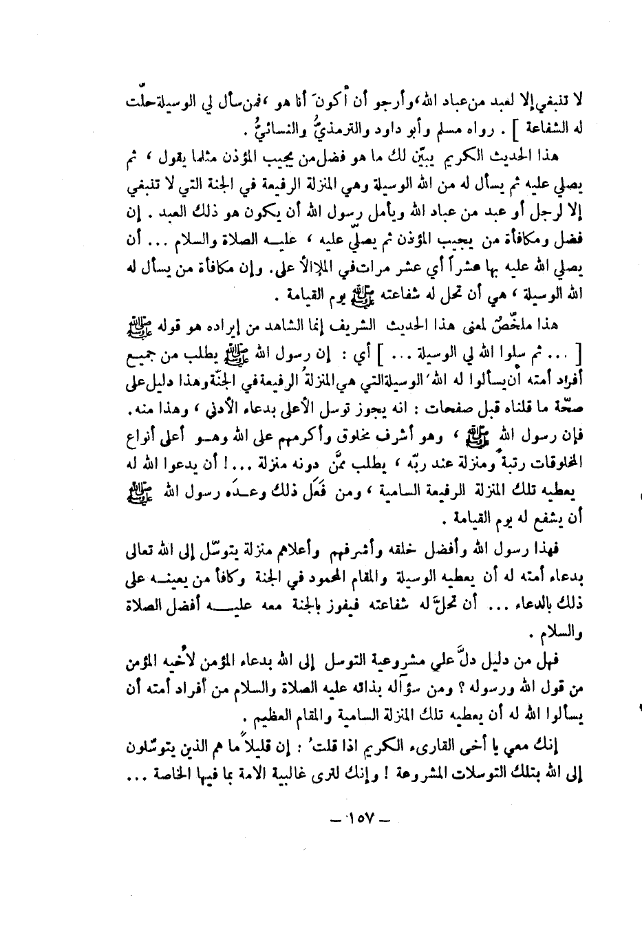 هذا ملخص لمعنى هذا الحديث الشريف إنما الشاهد من إيراده هو قوله - صلى الله عليه وسلم -[ ... ثم سلوا الله لي الوسيلة ... ] أي: إن رسول الله - صلى الله عليه وسلم - يطلب من جميع أفراد أمته أن يسألوا له الله الوسيلة التي هي المنزلة الرفيعة في الجنة وهذا دليل على صحة ما قلناه قبل صفحات: أن يجوز توسل الأعلى بدعاء الأدنى وهذا منه. فإن رسول الله - صلى الله عليه وسلم - وهو أشرف مخلوق وأكرمهم على الله وهو أعلى أنواع المخلوقات رتبة ومنزلة عند ربه يطلب ممن دونه منزلة .. ! أن يدعوا الله له يعطيه تلك المنزلة الرفيعة السامية ومن فعل ذلك وعده رسول الله - صلى الله عليه وسلم - أن يشفع له يوم القيامة.