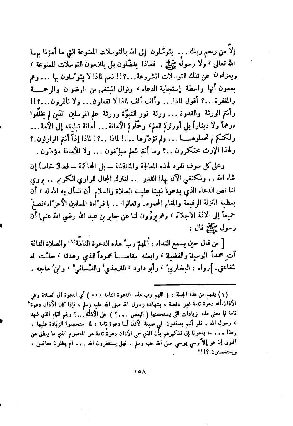 وعلى كل سوف نفرد لهذه المعالجة والمناقشة - بل المحاكمة - فصلاً خاصاً إن شاء الله ونكتفي الآن بهذا القدر ... لنترك المجال للراوي الكريم .. يروي لنا نص الدعاء الذي يدعونا نبينا عليه الصلاة والسلام أن نسأل به الله له أن يعطيه المنزلة الرفيعة والمقام المحمود وتعالوا يا قراءنا المسلمين الأعزاء نصغ جميعاً إلى الأئمة الأجلاء وهم يروون لنا عن جابر بن عبد الله رضي الله عنهما أن رسول - صلى الله عليه وسلم - قال: