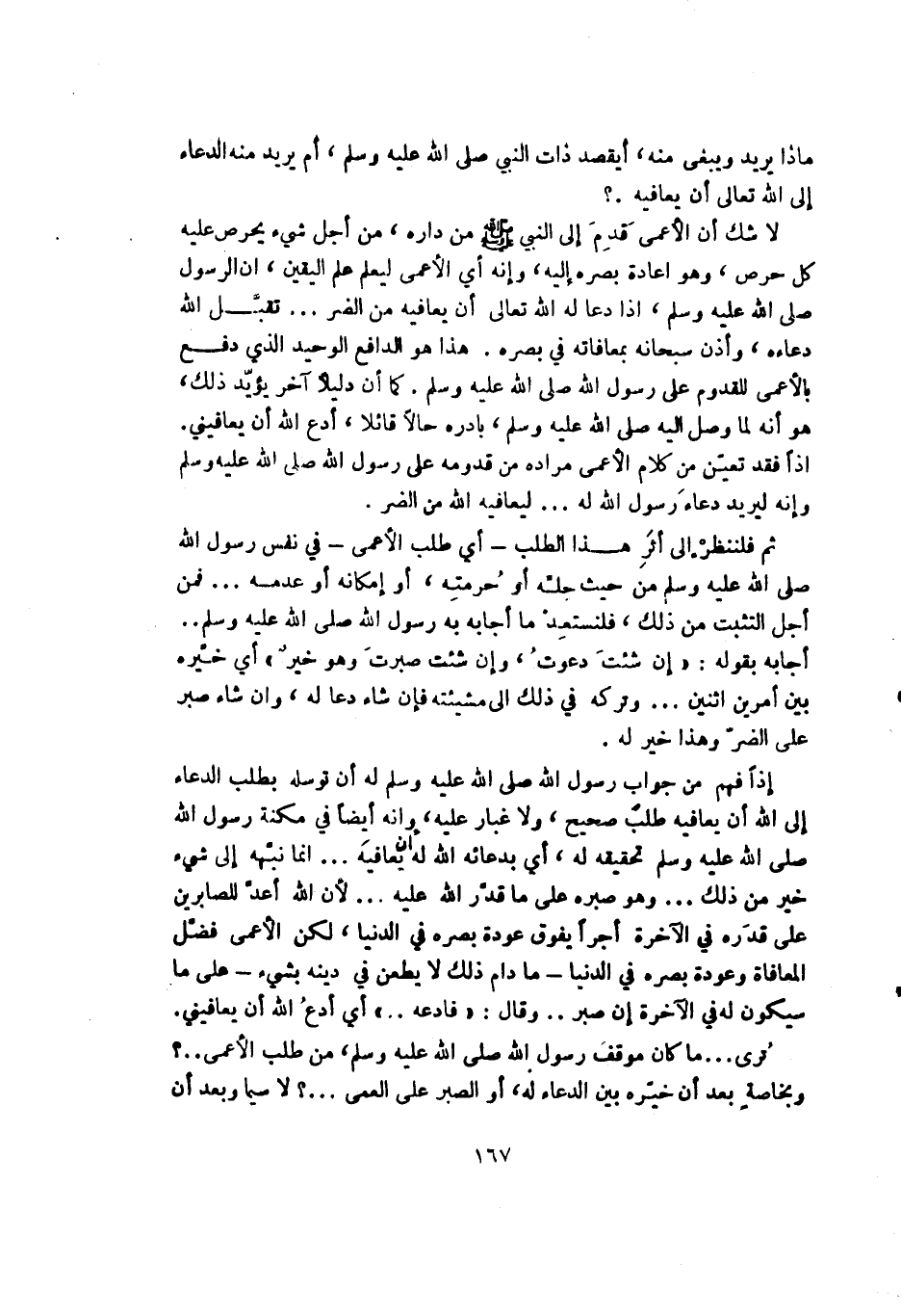 ثم فلننظر إلى أثر هذا الطلب - أي طلب الأعمى - في نفس رسول الله - صلى الله عليه وسلم - من حيث حله أو حرمته أو إمكانه أو عدمه ... فمن أجل التثبيت من ذلك فلنستعد ما أجابه به رسول الله - صلى الله عليه وسلم - ... أجابه بقوله: ((إن شئت دعوت وإن شئت صبرت وهو خير)) أي خيره بين أمرين اثنين وتركه في ذلك إلى مشيئته فإن شاء دعا له وإن شاء صبر على الضر وهذا خير له.