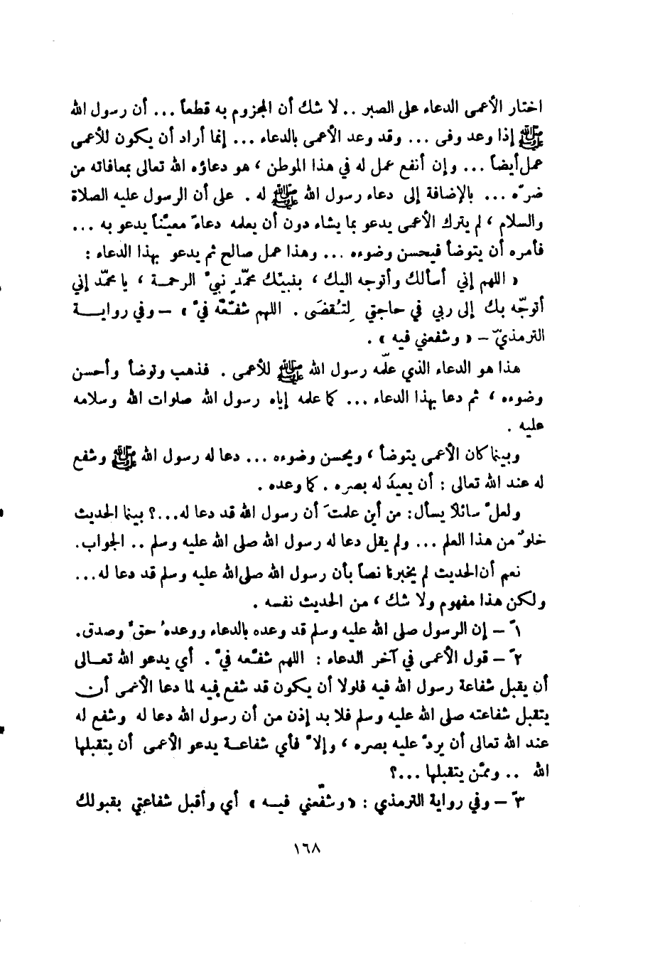 2 - قول الأعمى في آخر الدعاء: اللهم شفعه في أي يدعو الله تعالى أن يقبل شفاعة رسول الله فيه فلولا أن يكون قد شفع فيه لما دعا الأعمى أن يتقبل شفاعته - صلى الله عليه وسلم - فلا بد إذن من أن رسول الله دعا له وشفع له عند الله تعالى أن يرد عليه بصره وإلا فأي شفاعة يدعو الأعمى أن يتقبلها الله ... وممن يتقبلها ... ؟