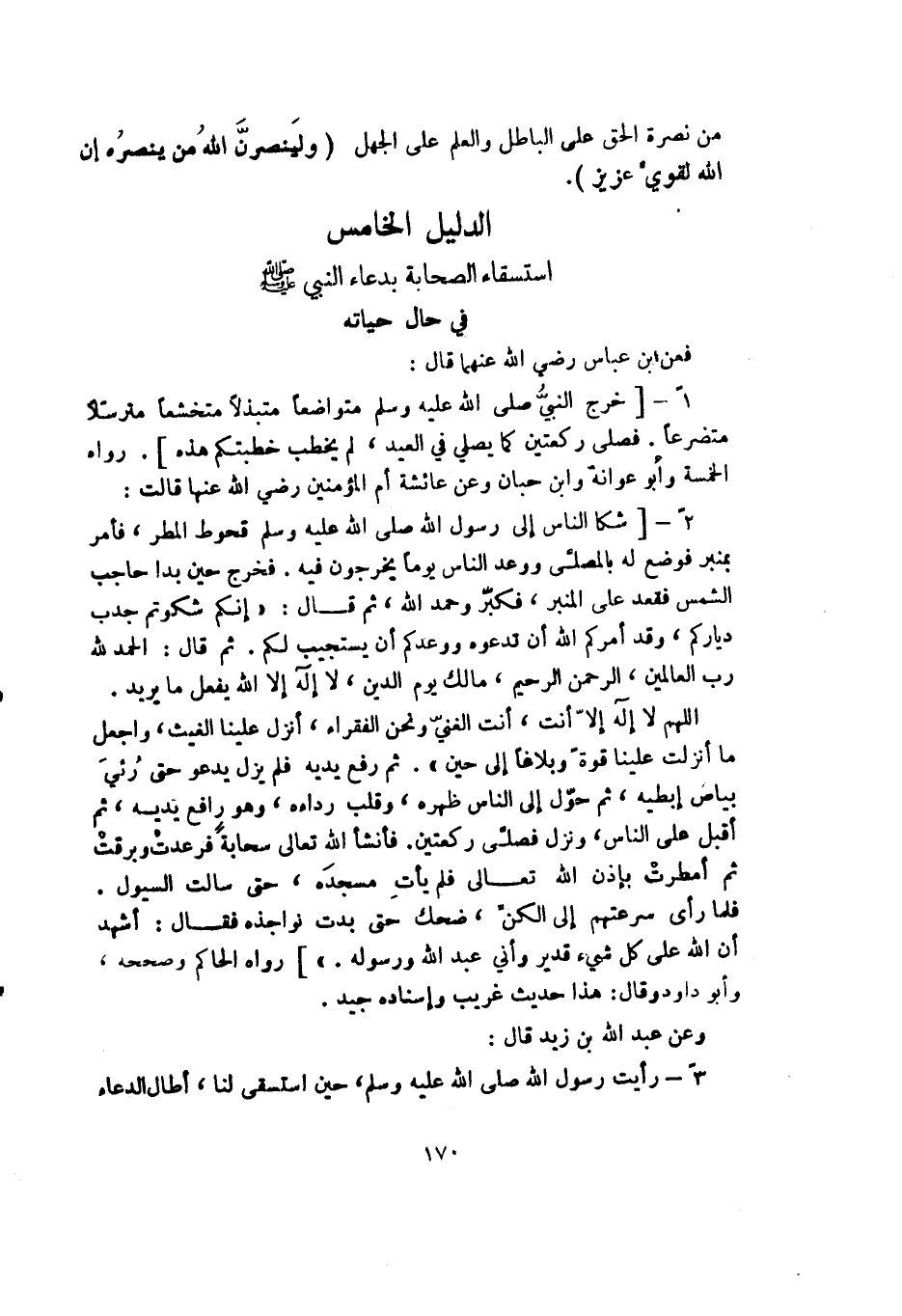 اللهم لا إله إلا أنت، أنت الغني ونحن الفقراء أنزل علينا الغيث واجعل ما أنزلت علينا قوة وبلاغاً إلى حين)). ثم رفع يديه فلم يزل يدعو حتى رئي بياض إبطيه ثم حول إلى الناس ظهره وقلب رداءه وهو رافع يديه ثم أقبل على الناس ونزل فصلى ركعتين فأنشأ الله تعالى سحابة فرعدت وبرقت ثم أمطرت بإذن الله تعالى فلم يأت مسجده حتى بالت السيول. فلما رأى سرعتهم إلى الكن ضحك حتى بدت نواجذه فقال: أشهد أن الله على كل شيء قدير وأني عبد الله ورسوله.))] رواه الحاكم وصححه، وأبو داود وقال: هذا حديث غريب وإسناده جيد.