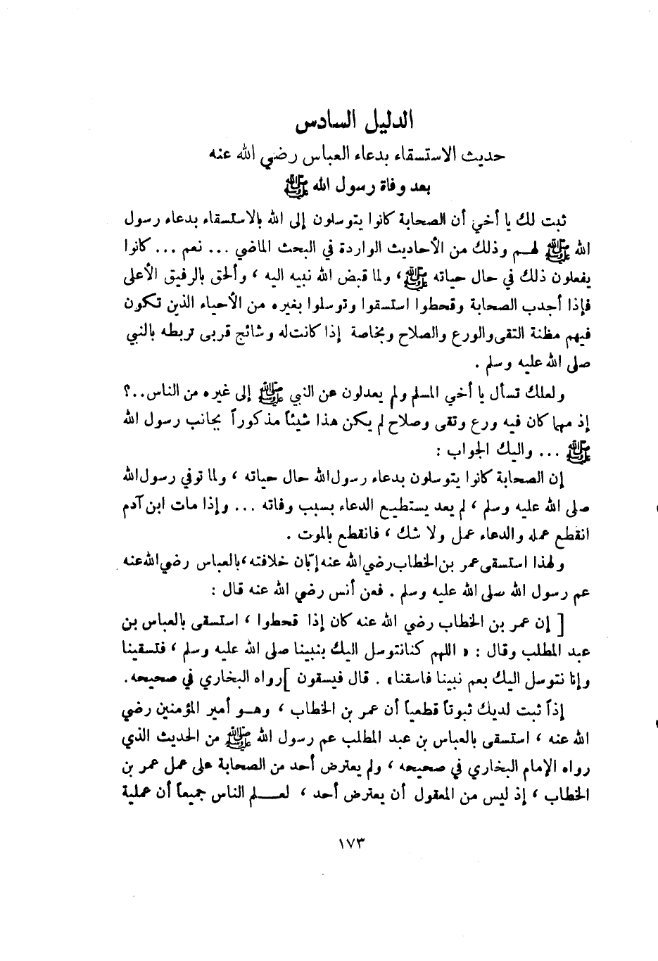 ثبت لك يا أخي أن الصحابة كانوا يتوسلون إلى الله بالاستسقاء بدعاء رسول الله - صلى الله عليه وسلم - لهم وذلك من الأحاديث الواردة في البحث الماضي ... نعم ... كانوا يفعلون ذلك في حال حياته - صلى الله عليه وسلم - ولما قبض الله نبيه إليه وألحق بالرفيق الأعلى فإذا أجذب الصحابة وقحطوا استسقوا وتوسلوا بغيره من الأحياء الذين تكون فيهم مظنة التقى والورع وبخاصة إذا كانت له وشائج قربى تربطه بالنبي - صلى الله عليه وسلم -.