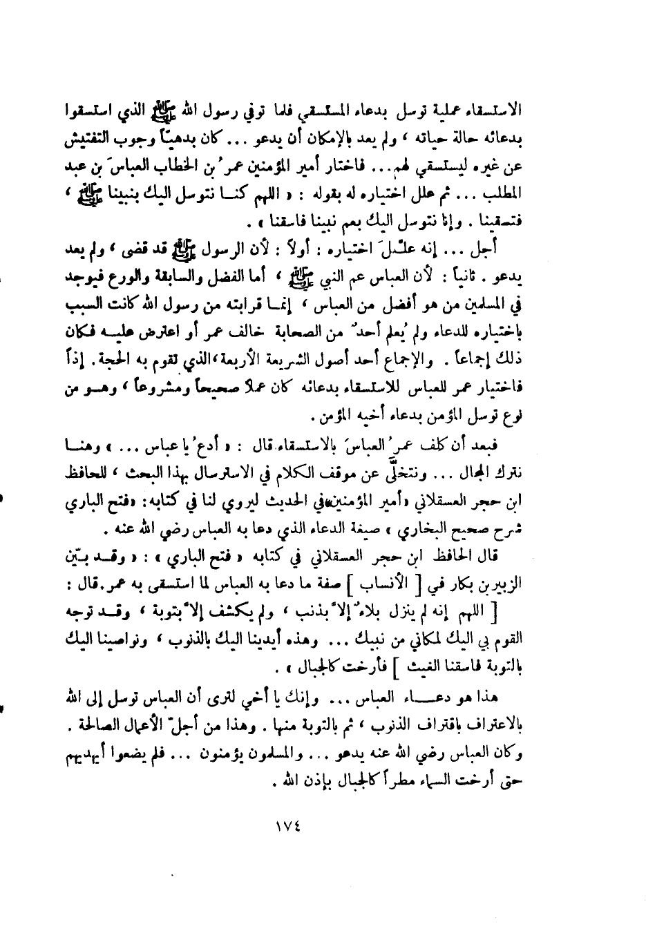 الاستسقاء عملية توسل بدعاء المستسقي فلما توفي رسول الله - صلى الله عليه وسلم - الذي استسقوا بدعائه حالة حياته ولم يعد بالإمكان أن يدعو ... كان بدهياً وجوب التفتيش عن غيره ليستسقي لهم ... فاختار أمير المؤمنين عمر بن الخطاب العباس بن عبد المطلب ... ثم علل اختياره له بقوله: ((اللهم كنا نتوسل إليك بنبينا - صلى الله عليه وسلم - فتسقينا. وإنا نتوسل إليك بعم نبينا فاسقنا)).