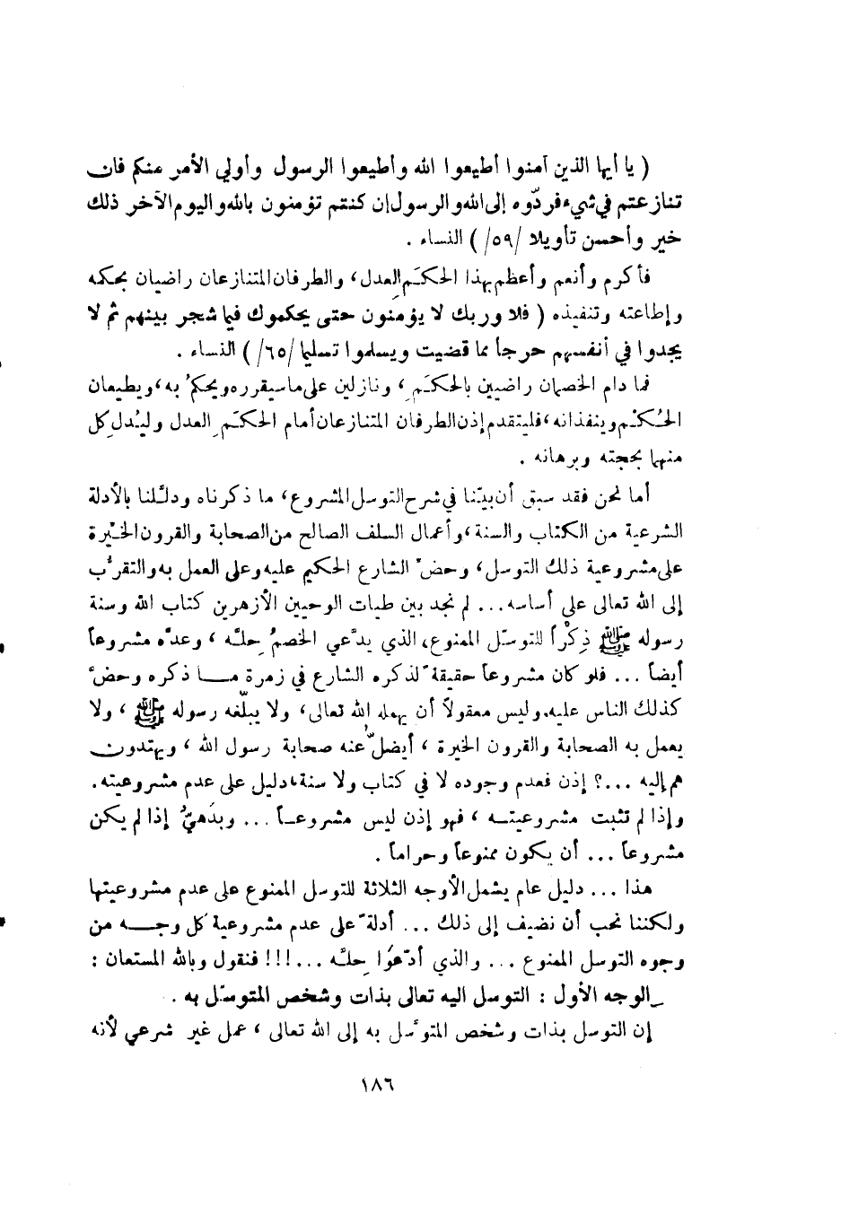 أما نحن فقد سبق أن بينا في شرح التوسل المشروع ما ذكرناه ودللناه بالأدلة الشرعية من الكتاب والسنة وأعمال السلف الصالح من الصحابة والقرون الخيرة على مشروعية ذلك التوسل وحض الشارع الحكيم عليه وعلى العمل به والتقرب إلى الله تعالى على أساسه ... لم نجد بين طيات الوحيين الأزهرين كتاب الله وسنة رسوله - صلى الله عليه وسلم - ذكراً للتوسل الممنوع الذي يدعي الخصم حله وعده مشروعاً أيضاً ... فلو كان مشروعاً حقيقة لذكره الشارع في زمرة ما ذكره وحض كذلك الناس عليه وليس معقولاً أن يهمله الله تعالى ولا يبلغه رسوله - صلى الله عليه وسلم - ولا يعمل به الصحابة والقرون الخيرة أًيًضلّ عنه صحابة رسول الله، ويهتدون هم إليه ... ؟ إذن فعدم وجوده لا في كتاب ولا سنة دليل على عدم مشروعيته. وإذا لم تثبت مشروعيته فهو إذن ليس مشروعاً ... وبدهيّ إذا لم يكن مشروعاً ... أن يكون ممنوعاً وحراماً.