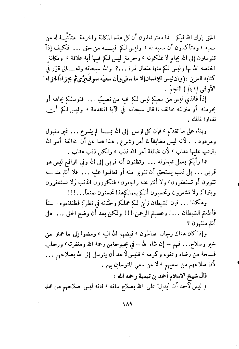 وإذا كان هناك رجال صالحون قبضهم الله إليه ومضوا إلى ما عملو من خير وصلاح ... فهم - إن شاء الله - في بحبوحة من رحمة الله ومغفرته ورحاب فسيحة من رضاه وعفوه وكرمه، فليس لأحد أن يتوسل إلى الله بصلاحهم ... لأن صلاحهم من سعيهم لا من سعي المتوسلين بهم.
