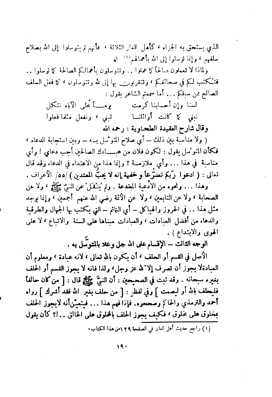 الذي يستحق به الجزاء كأهل الغار الثلاثة، فإنهم لم يتوسلوا إلى الله بصلاح سلفهم وإنما توسلوا إلى الله بأعمالهم (¬1) اهـ.