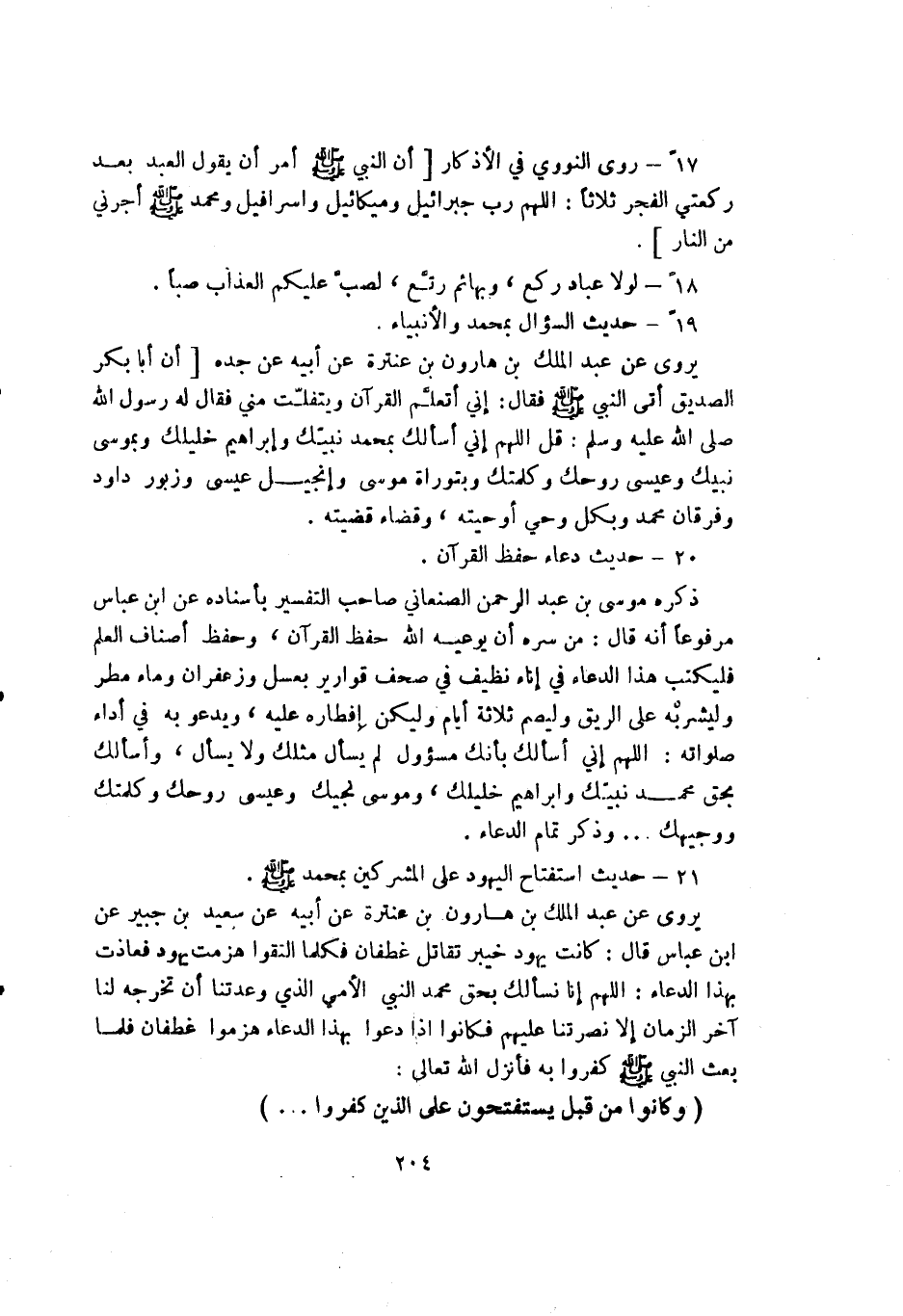 17 - روى النووي في الأذكار [أن النبي - صلى الله عليه وسلم - أمر أن يقول العبد بعد ركعتي الفجر ثلاثاً: اللهم رب جبرائيل وميكائيل وإسرافيل ومحمد - صلى الله عليه وسلم - أجرني من النار].