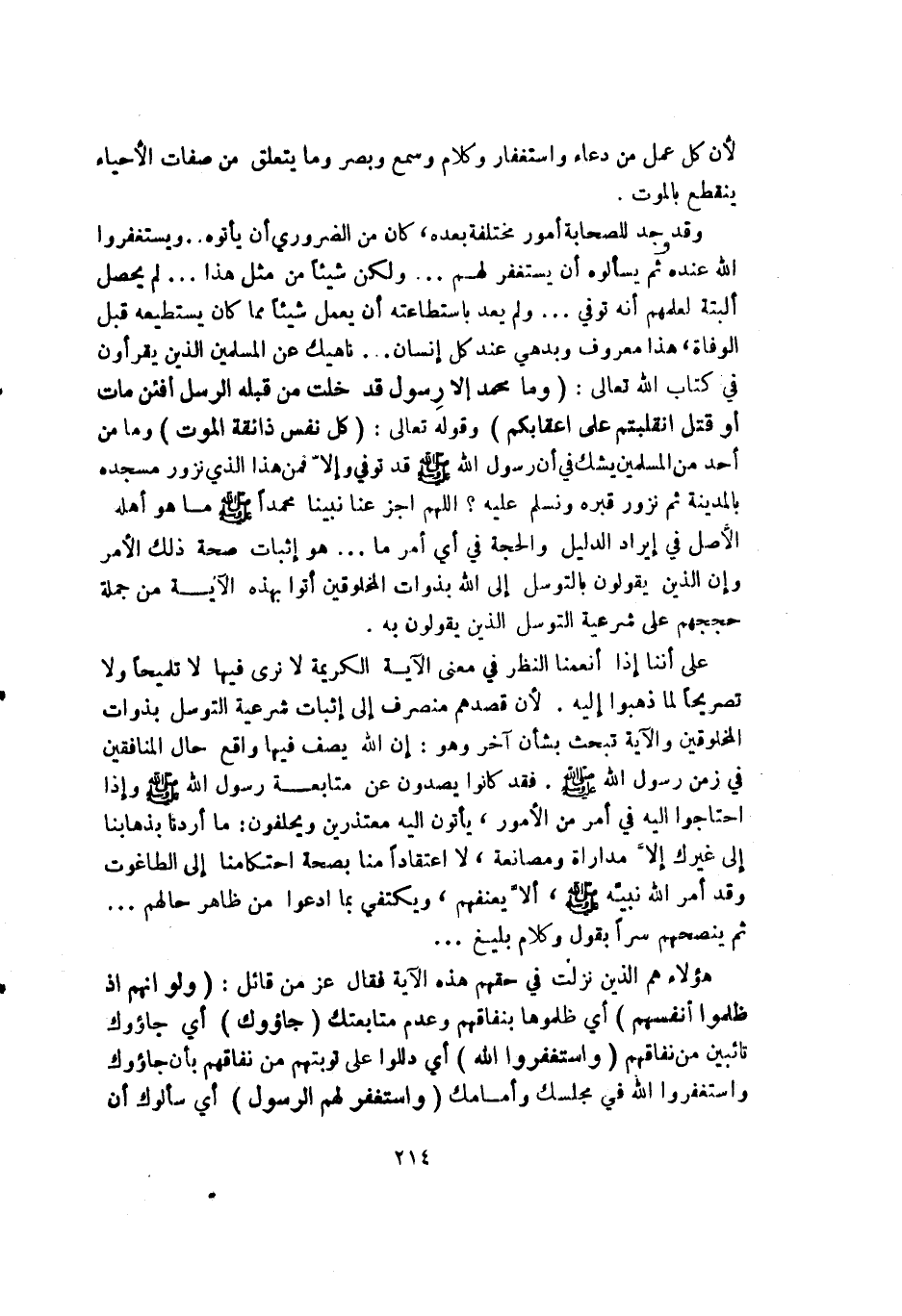 وقد جد للصحابة أمور مختلفة بعده كان من الضروري أن يأتوه ويستغفروا الله عنده ثم يسألوه أن يستغفر لهم ... ولكن شيئاً من مثل هذا ... لم يحصل ألبتة لعلمهم أنه توفي ... ولم يعد باستطاعته أن يعمل شيئاً مما كان يستطيعه قبل الوفاة هذا معروف وبدهي عند كل إنسان ناهيك عن المسلمين الذين يقرأون في كتاب الله تعالى: (وما محمد إلا رسول قد خلت من قبله الرسل أفئن مات أو قتل انقلبتم على أعقابكم) وقوله تعالى: (كل نفس ذائقة الموت) وما من أحد من المسلمين يشك في أن رسول الله - صلى الله عليه وسلم - قد توفي وإلا فمن هذا الذي نزور مسجده بالمدينة ثم نزور قبره ونسلم عليه؟ اللهم أجز عنا نبينا محمداً - صلى الله عليه وسلم - ما هو أهله الأصل في إيراد الدليل والحجة في أي أمر ما هو إثبات صحة ذلك الأمر وإن الذين يقولون بالتوسل إلى الله بذوات المخلوقين أتوا بهذه الآية من جملة حججهم على شرعية التوسل الذين يقولون به.