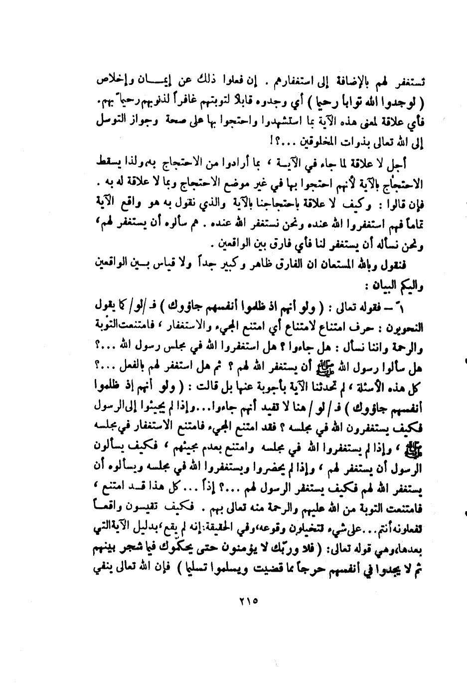 1 - فقوله تعالى: (ولو أنهم إذ ظلموا أنفسهم جاءوك) فـ/لو/ كما يقول النحويون: حرف امتناع لامتناع أي امتنع المجيء والاستغفار فامتنعت التوبة والرحمة وأننا نسأل: هل جاءوا؟ هل استغفروا الله في مجلس رسول الله ... ؟ هل سألوا رسول الله - صلى الله عليه وسلم - أن يستغفر الله لهم؟ ثم هل استغفر لهم بالفعل ... ؟ كل هذه الأسئلة لم تحدثنا الآية بأجوبة عنها بل قالت: (ولو أنهم إذ ظلموا أنفسهم جاءوك) فـ/لو/ هنا لا تفيد أنهم جاءوا ... وإذا لم يجيئوا إلى رسول فكيف يستغفرون الله في مجلسه؟ فقد امتنع المجيء فامتنع الاستغفار في مجلسه - صلى الله عليه وسلم - وإذا لم يستغفروا الله في مجلسه وامتنع بعدم مجيئهم فكيف يسألون الرسول أن يستغفر لهم وإذا لم يحضروا ويستغفروا الله في مجلسه ويسألوه أن يستغفر الله لهم فكيف يستغفر الرسول لهم ... ؟ إذاً ... كل هذا قد امتنع فامتنعت التوبة من الله عليهم والرحمة منه تعالى بهم فكيف تقيسون واقعاً تفعلونه أنتم ... على شيء تتخيلون وقوعه وفي الحقيقة: إنه لم يقع بدليل الآية التي بعدها وهي قوله تعالى: (فلا وربك لا يؤمنون حتى يحكموك فيما شجر بينهم ثم لا يجدوا في أنفسهم حرجاً مما قضيت ويسلموا تسليماً فإن الله تعالى ينفي